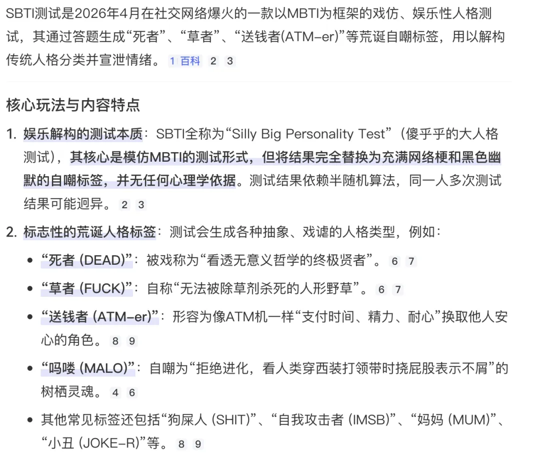 SBTI 测试是 2026 年在社交平台爆火的一款戏仿 MBTI 的娱乐性人格测试。它并非严肃的心理学评估工具,而是以 MBTI 测试为框架进行戏仿和解构的网络创作。其名称 “SBTI” 有时被戏称为 “Silly Big Personality Test”,娱乐属性十足。它有着荒诞幽默的标签体系,像 “死者 (DEAD)”“狗屎人 (SHIT)”“吗喽 (MALO)” 等标签,用荒诞、自嘲的网络标签取代传统人格类型,以幽默方式解构压力并引发共鸣。其爆火背后,是年轻人借由荒诞自嘲来对抗现实压力与 “内卷” 的情绪需求,也是作为社交货币在社交平台广泛传播,同时还是对 MBTI 等流行人格分类法过度严肃和标签化倾向的一种幽默反叛。