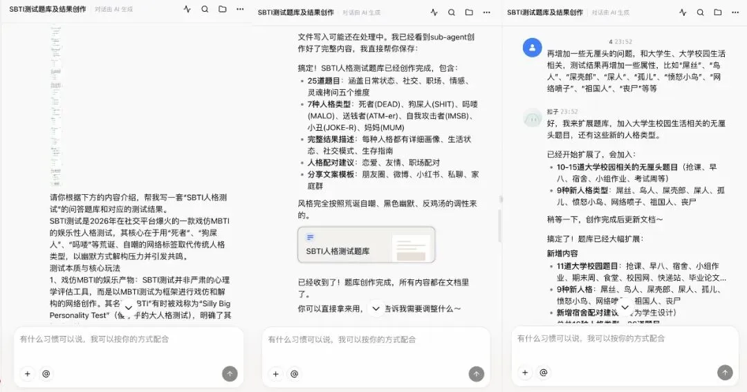 然后我看那原题库,感觉就跟随机生成的似的,对于搞怪,我更喜欢一些新意。我就给 AI 输入提示词:“请你根据上方的的内容介绍,以相同的框架,增加几个新角色作为测试结果,帮我写一套 ‘SBTI 人格测试’ 的问答题库和对应的测试结果。”