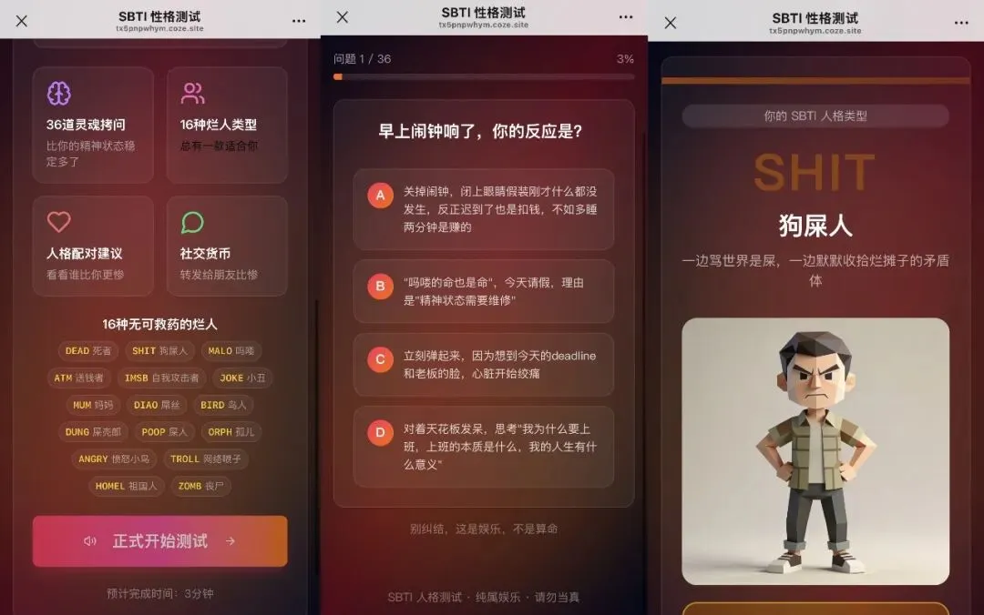 一方面年轻人压力大,就喜欢用这种荒诞自嘲的方式来对抗 “内卷”,消解生活里的焦虑;另一方面,测试结果和配套的文案图片特别容易在朋友圈、微博这些社交平台分享,成了新的社交话题,大家互相调侃一下,这类新型的“社交货币”引发了一场集体的“朋友圈狂欢”;还有就是,它也是对 MBTI 那种太严肃、太标签化的人格分类法的一种幽默反叛。