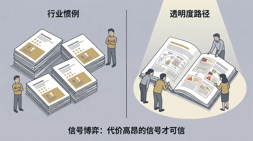 这里涉及的是一个经典的信号博弈逻辑。在信息不对称的市场里,可信的信号往往是那些”代价高昂”的信号——容易说的话,没有信息含量;只有那些说出来会付出代价的话,才能真正传递信息。主动披露产品缺陷,意味着接受更多质疑、可能影响商业推广、给竞争对手提供攻击素材。这个代价,让这份披露本身变得可信。