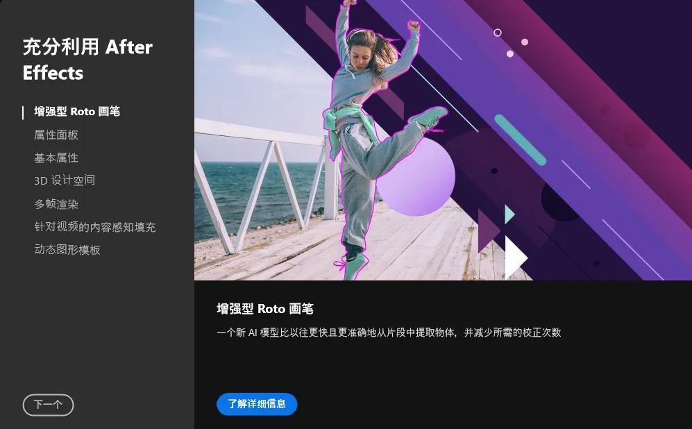 After Effects 最主要更新就是 Roto 笔刷 3.0,新的 AI 模型能比以往更快、更准确地从素材中提取对象,需要进行的校正也更少。