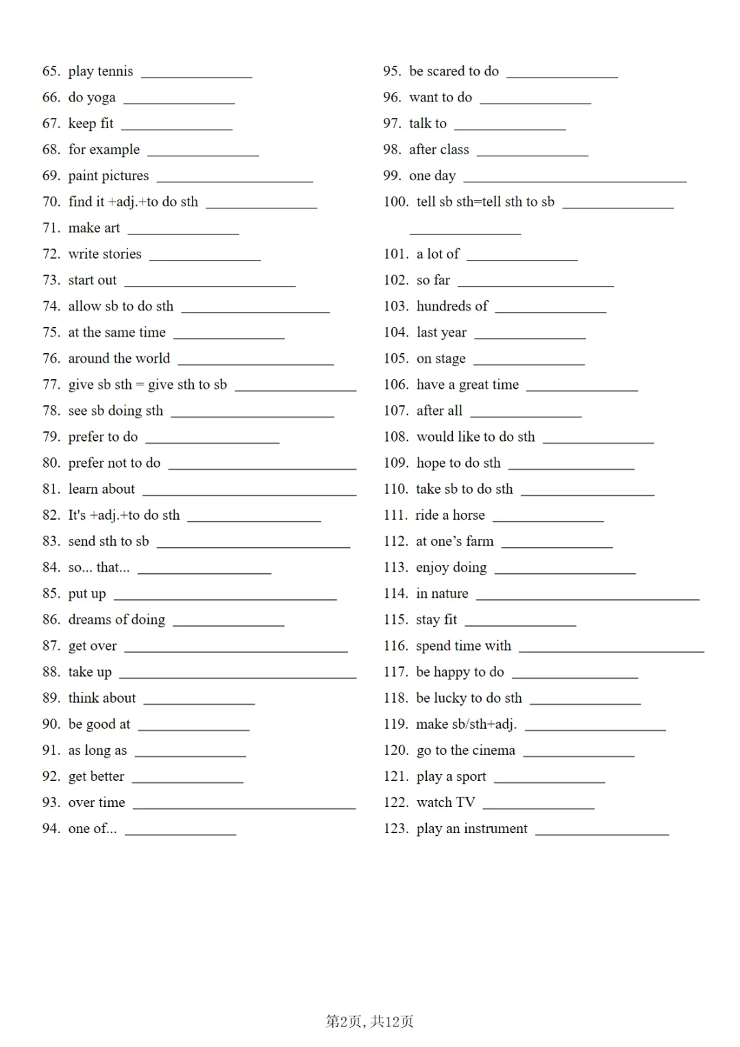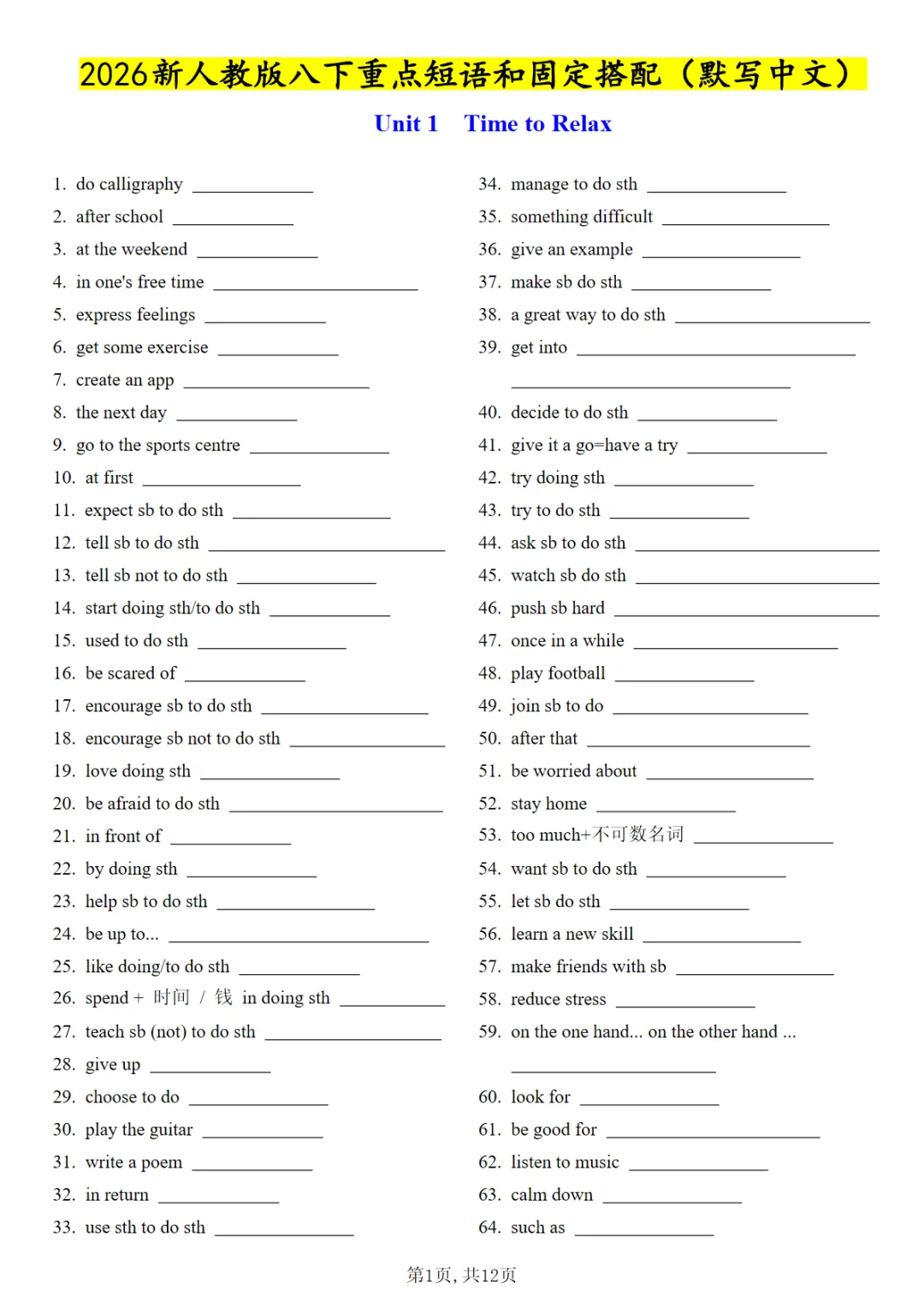 【免费下载】八年级(下)英语 26春重点短语及固定搭配-(默写中文)《人教版》,PDF电子版,共12页,先保存,以免资源失效