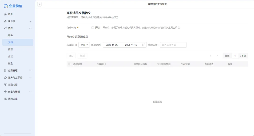 注:开通文档高级功能后,即可自动转交分配了高级功能的成员的文档资产。开启自动转交后,分配了高级功能的成员离职时,创建的文档将自动交接给其直属上级。