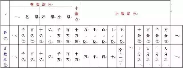 九、整数和小数的数位顺序表: