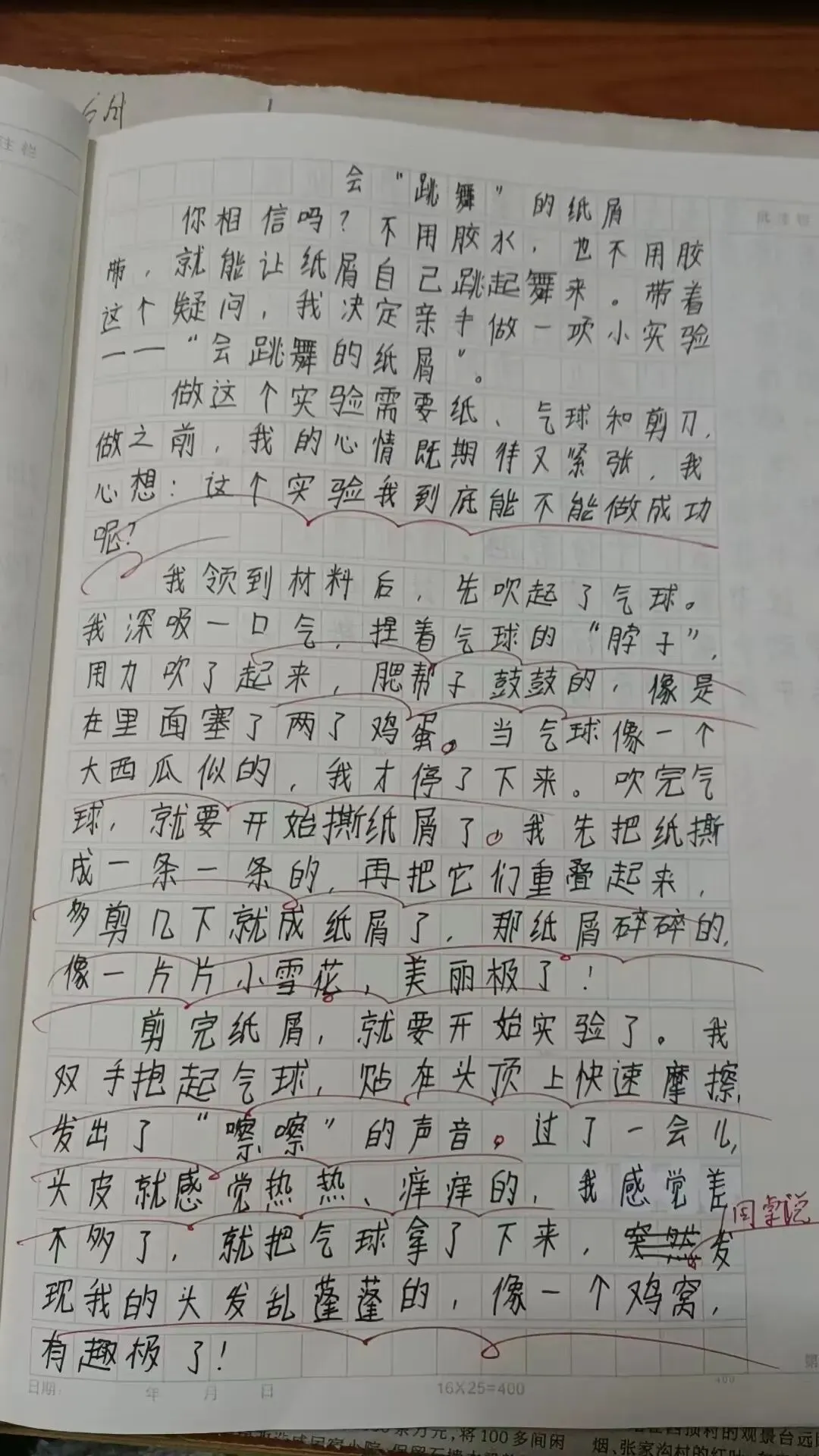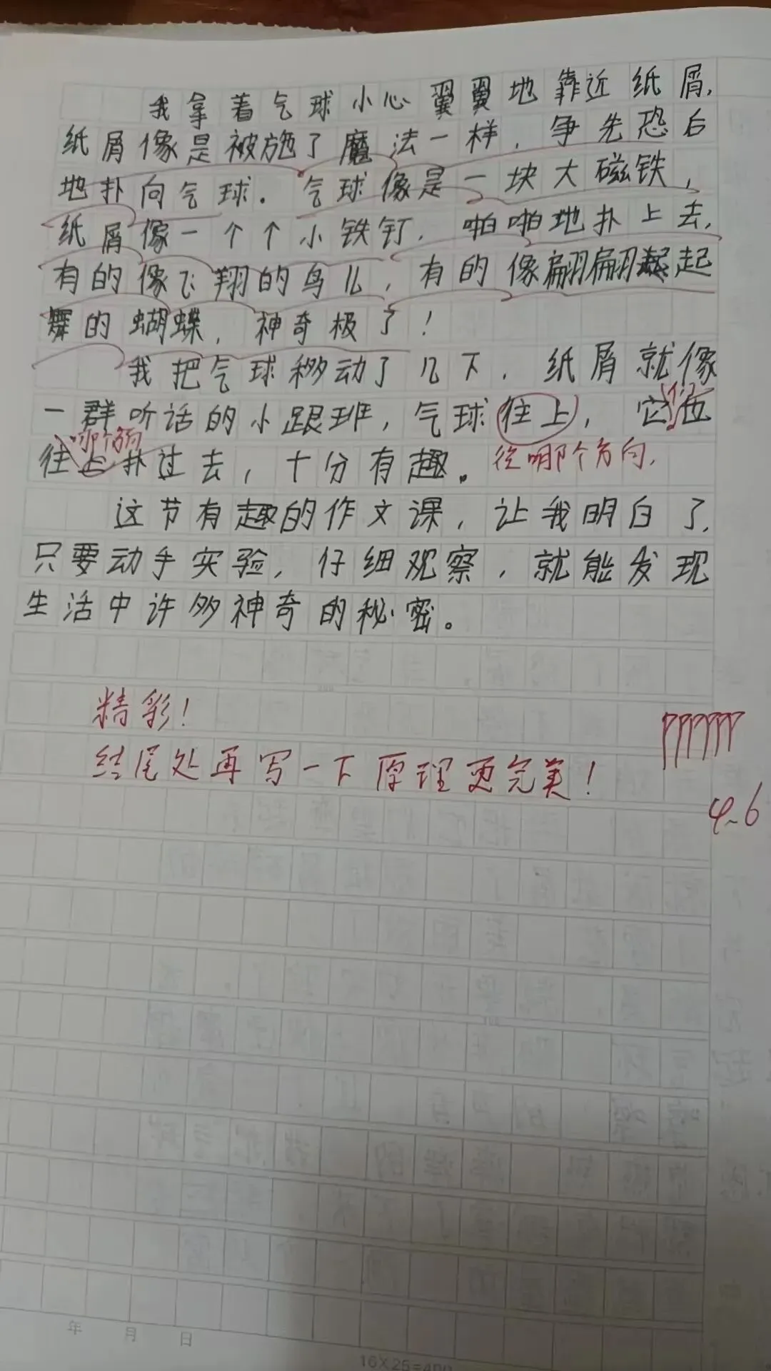 点评:写得很好,生动有趣,细节描写很精彩。如果把气球粘纸屑的原理介绍一下,更完美。