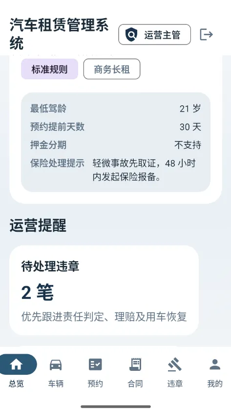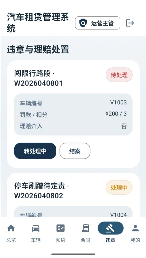 • 违章处理:记录和管理车辆在租赁期间的违章信息及处理流程。 -
