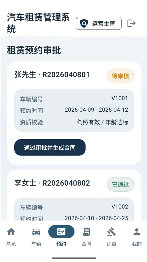 • 租赁预约:用户可以浏览可用车辆并提交租赁预约请求。 -