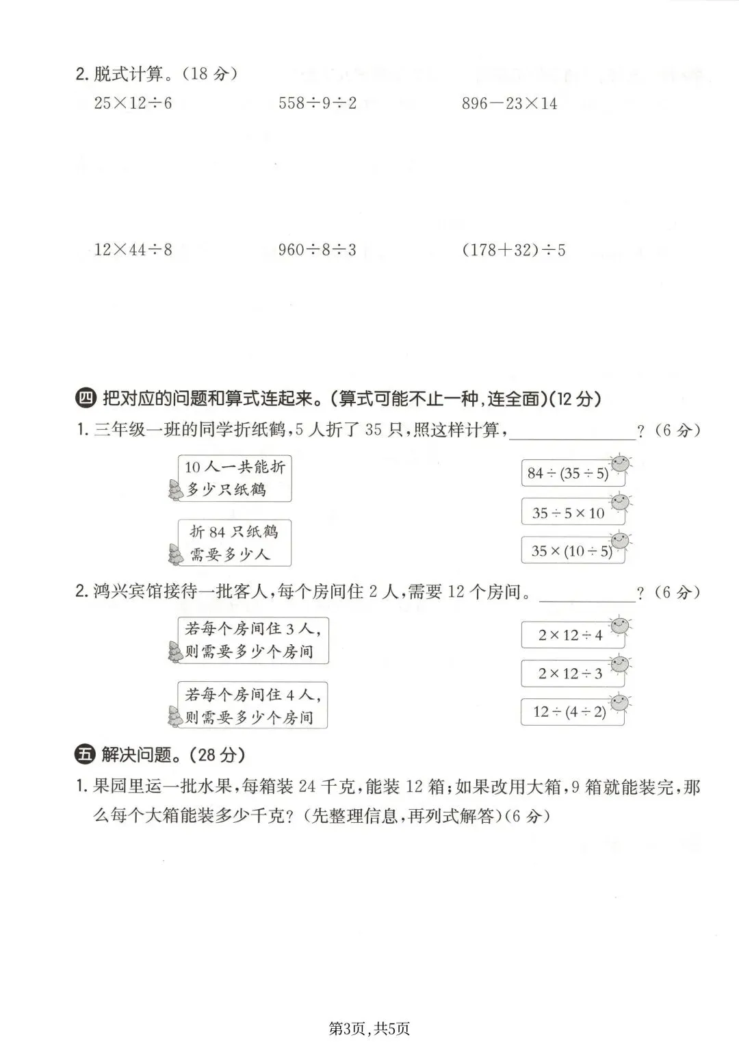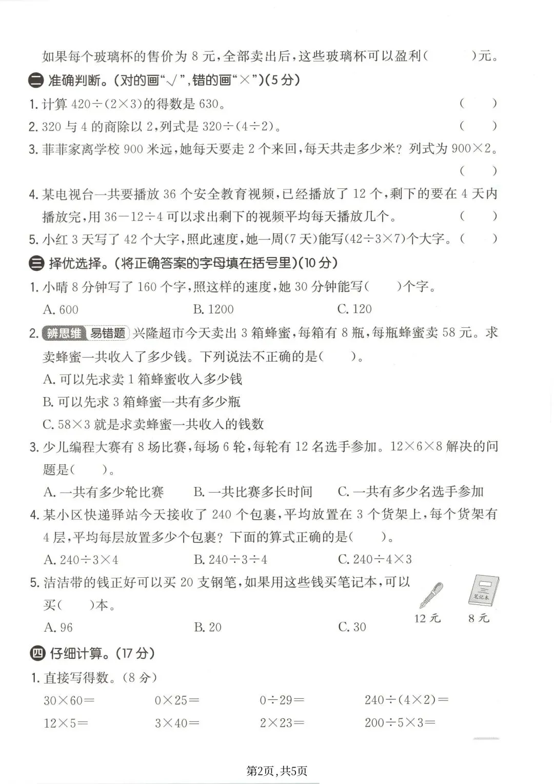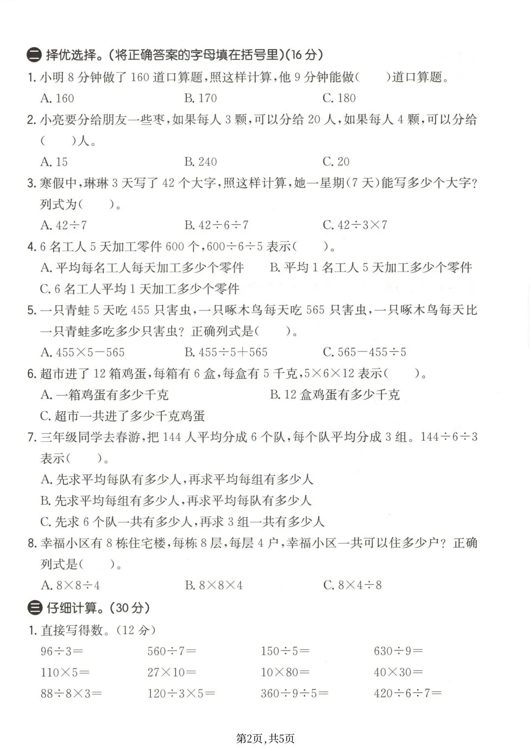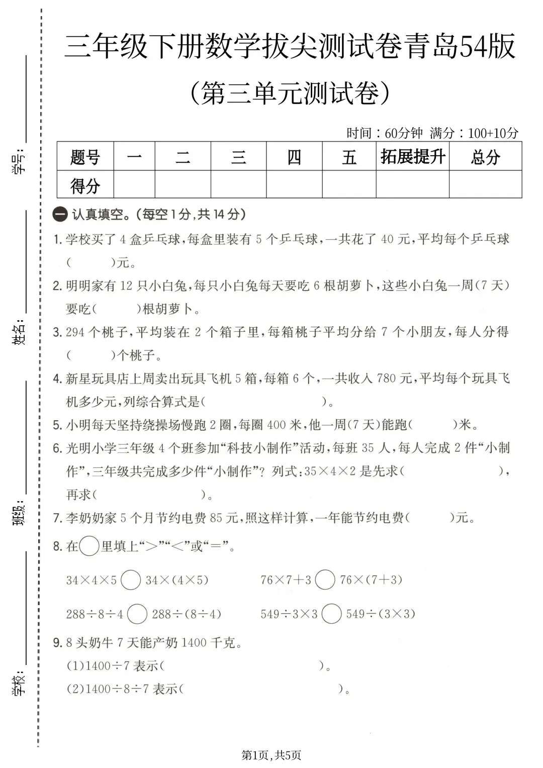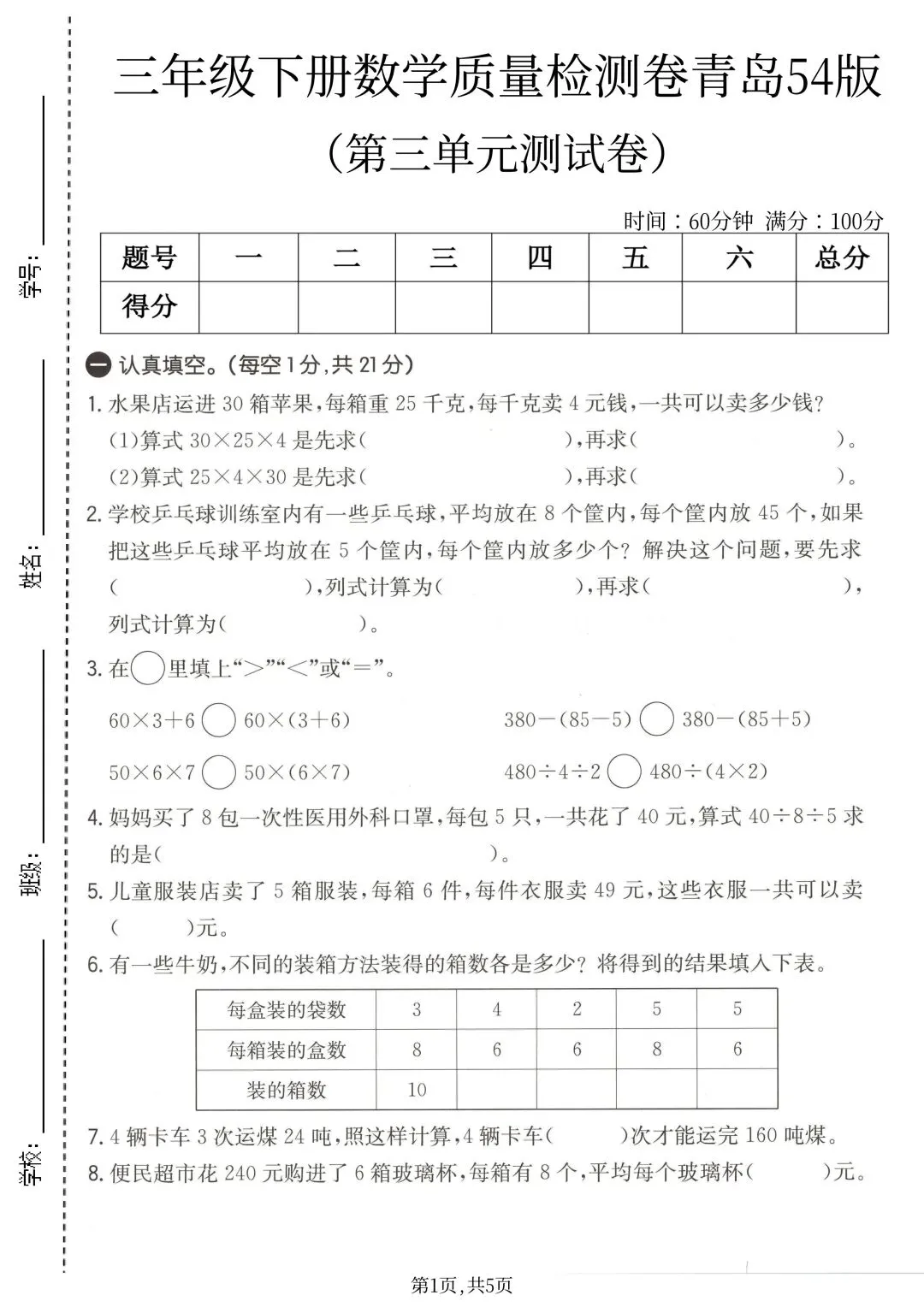 今天分享的是三年级下册青岛54版数学《第三单元检测卷》,大家可以按需自取,还可以分享到班级群或者朋友圈,我们一起助力孩子们高效学习。