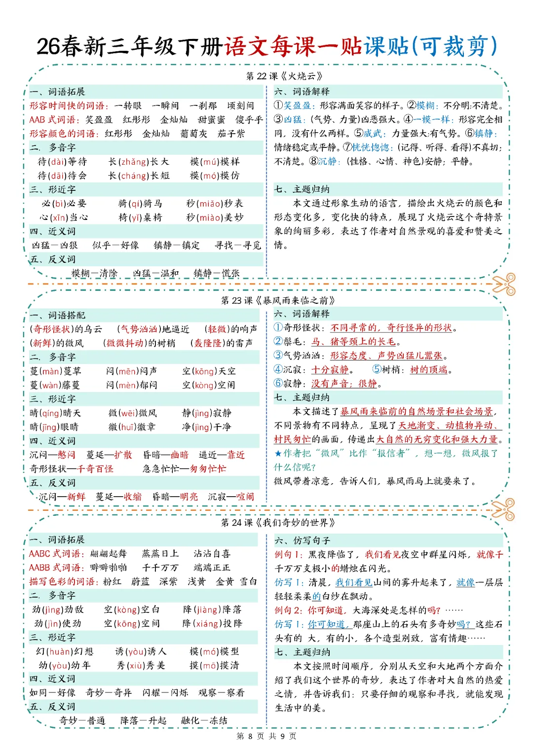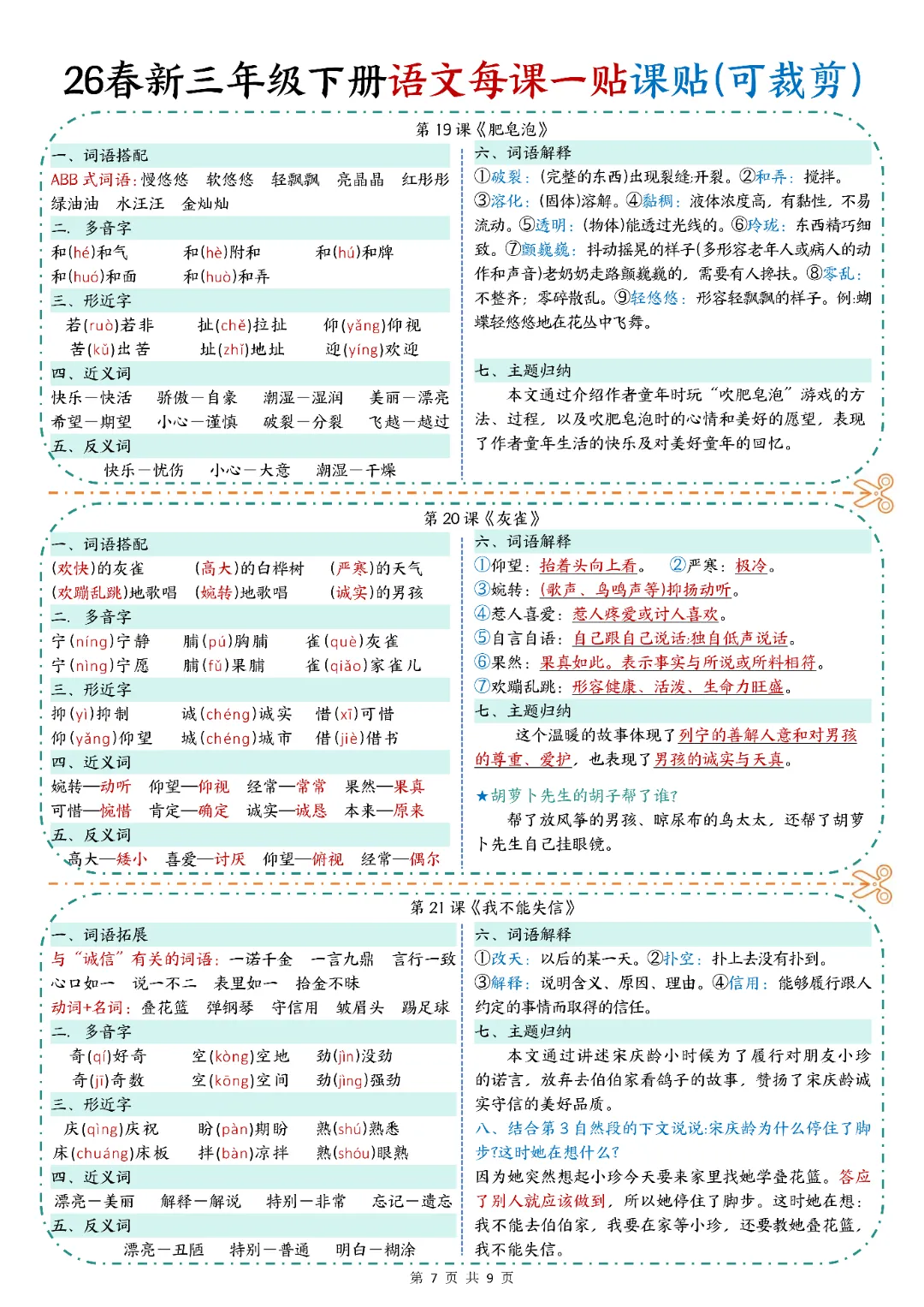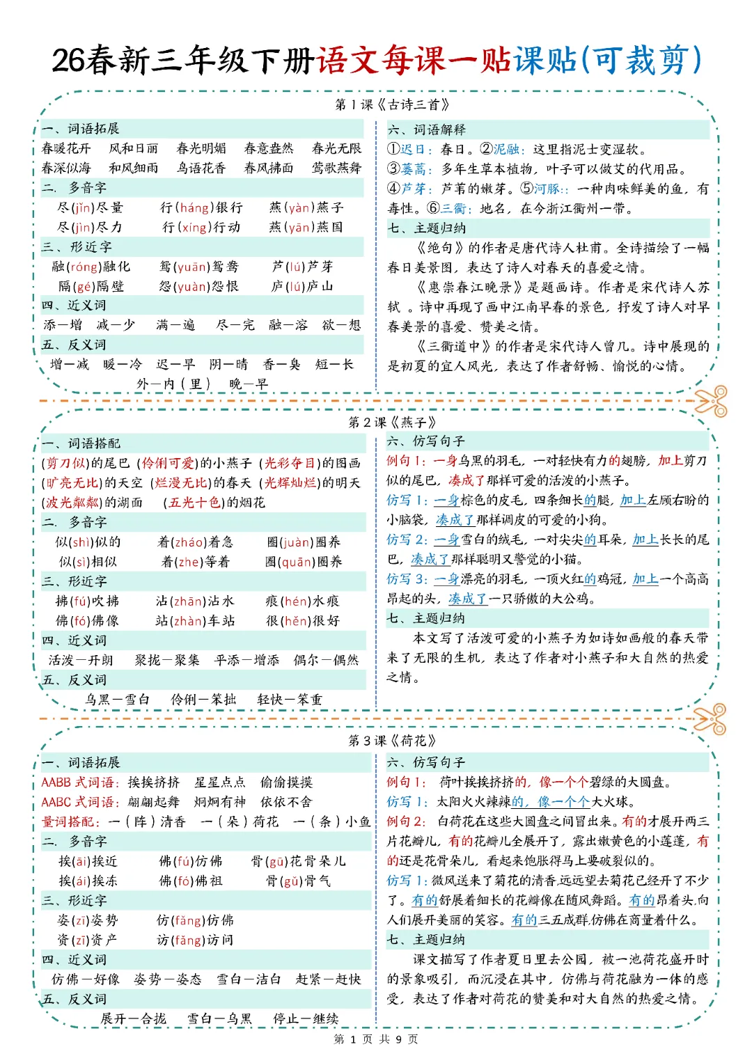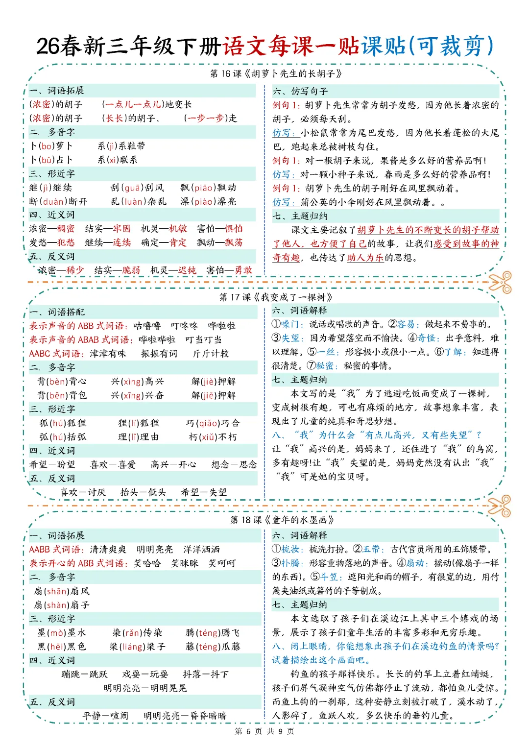2026春人教统编版三年级下册语文《每课一贴》,含详细答案共9页(篇幅原因,仅仅展示部分内容),电子版可打印可下载。围绕三年级下册下册考试核心,展开练习,帮助孩子深入理解题型,夯实学科基础,培养孩子逻辑思维,提升知识综合运用能力与应试技巧,助力升学能力培养,从从容容游刃有余的度过春季学期。欢迎转发分享到班级群, 需要的家长们和老师们抓紧领取一份吧。