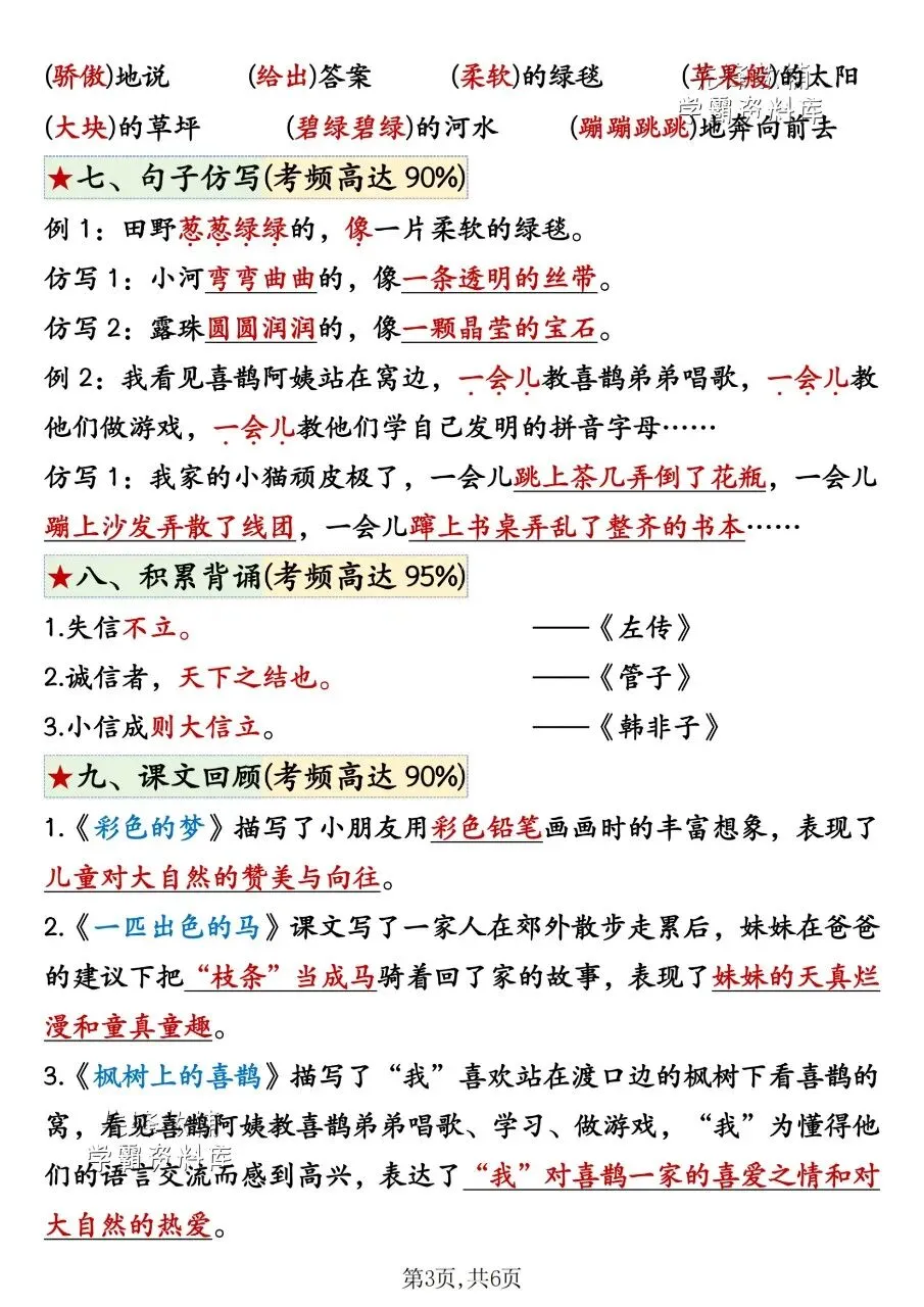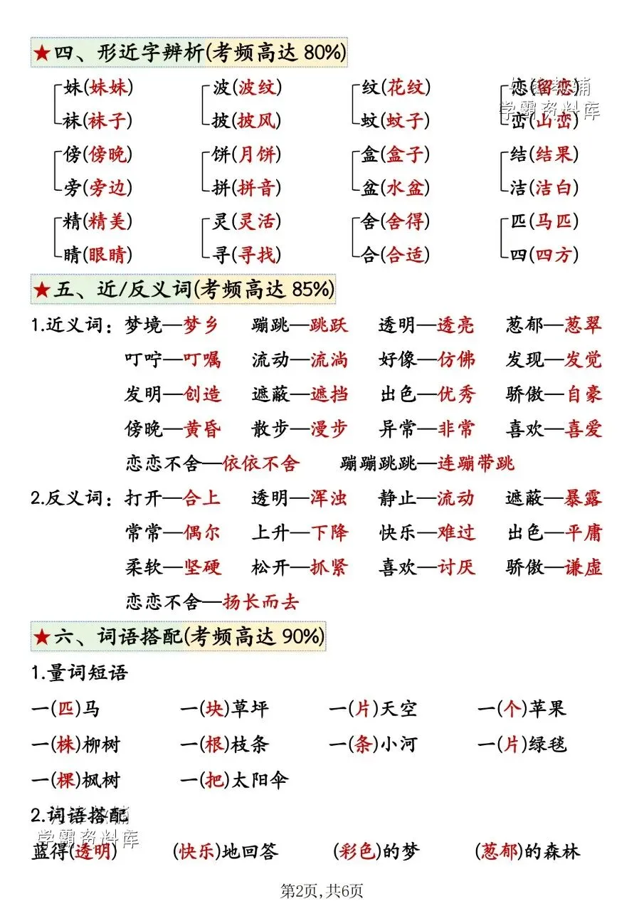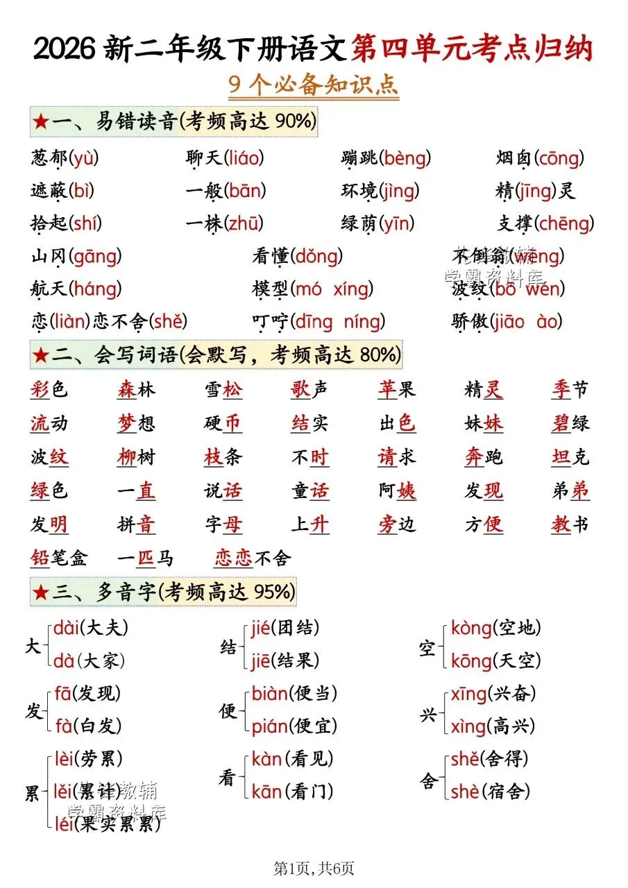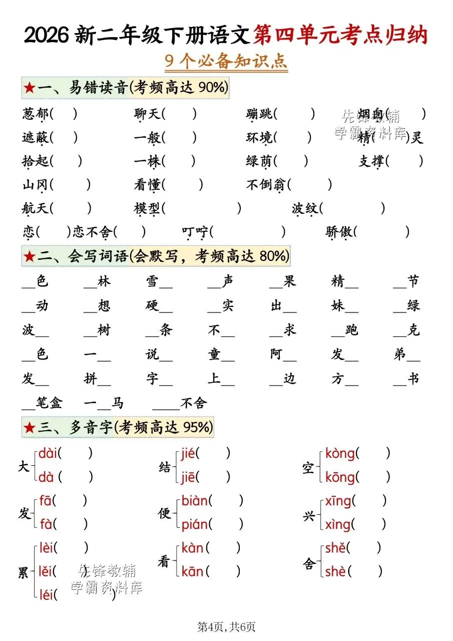 二年级下册语文|语文第四单元考点归纳(可下载打印) 小学资料每日更新,具体看完整PDF版本 (温馨提示:文末👇有完整电子版下载🔗) 新版二年级下册语文 语文第四单元考点归纳 共6页,提炼9个高频考点:易错读音、必会默写词语、多音字、形近字、近反义词、词语搭配、句子仿写、诚信名言积累、课文中心回顾。内容贴合课本,标注考频,适合单元复习、考前背诵与默写练习。 △因篇幅有限,只展示部分资料截图△ ↓↓↓ 领取完整电子版: ①:点一点右下角的“👍”和“❤️”,感谢🙏 ②:在公众号对话框回复:1061 小学同步学语文 资料合集:👇👇 小学学习方法 二年级下册数学