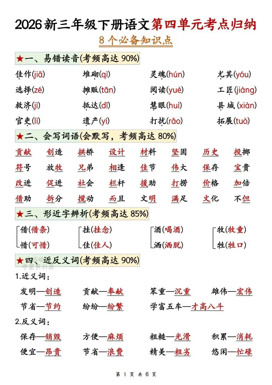 易错读音、必会默写词语、形近字、近反义词、多音字、词语搭配、重点句子仿写(转折、列数字、排比)、课文内容与中心回顾。