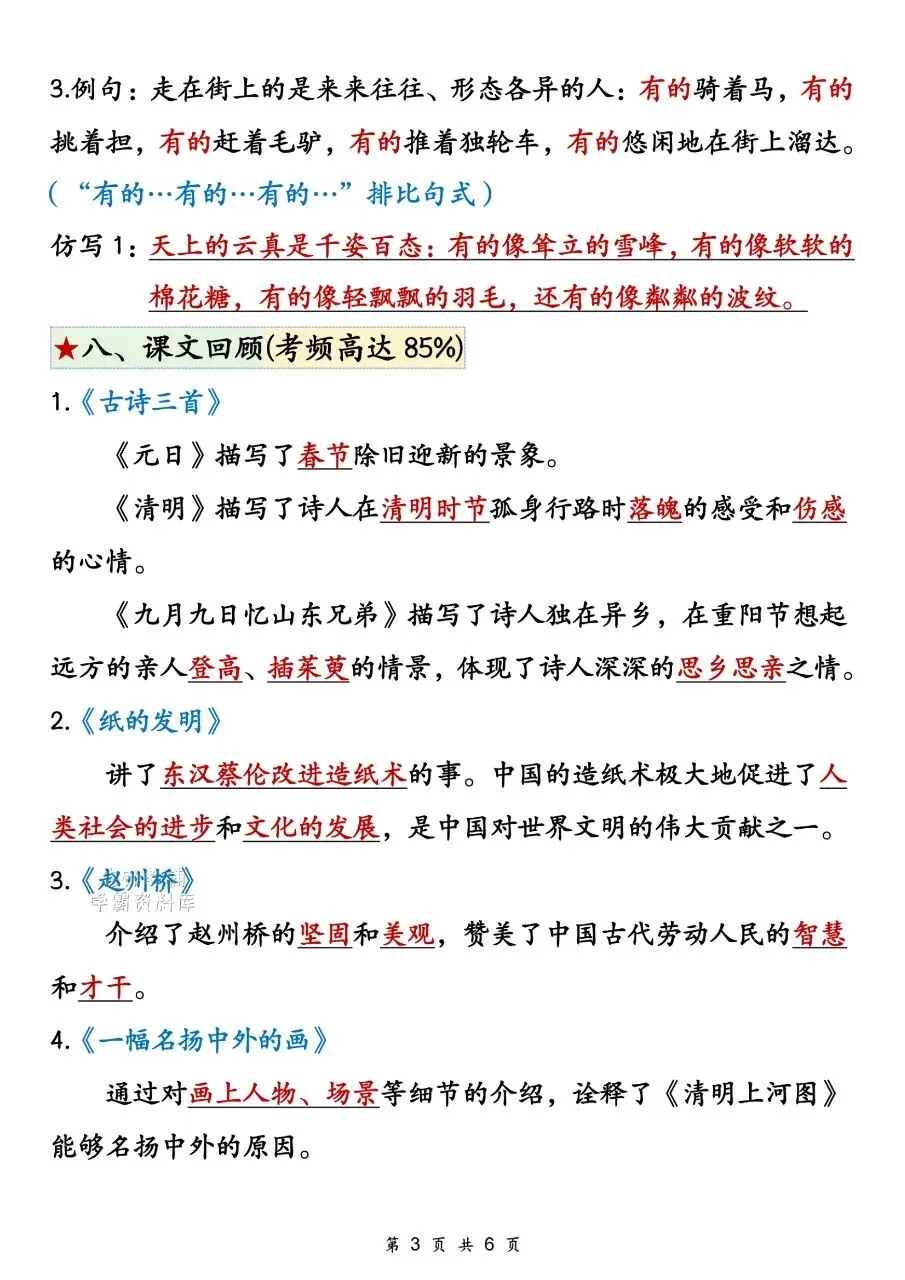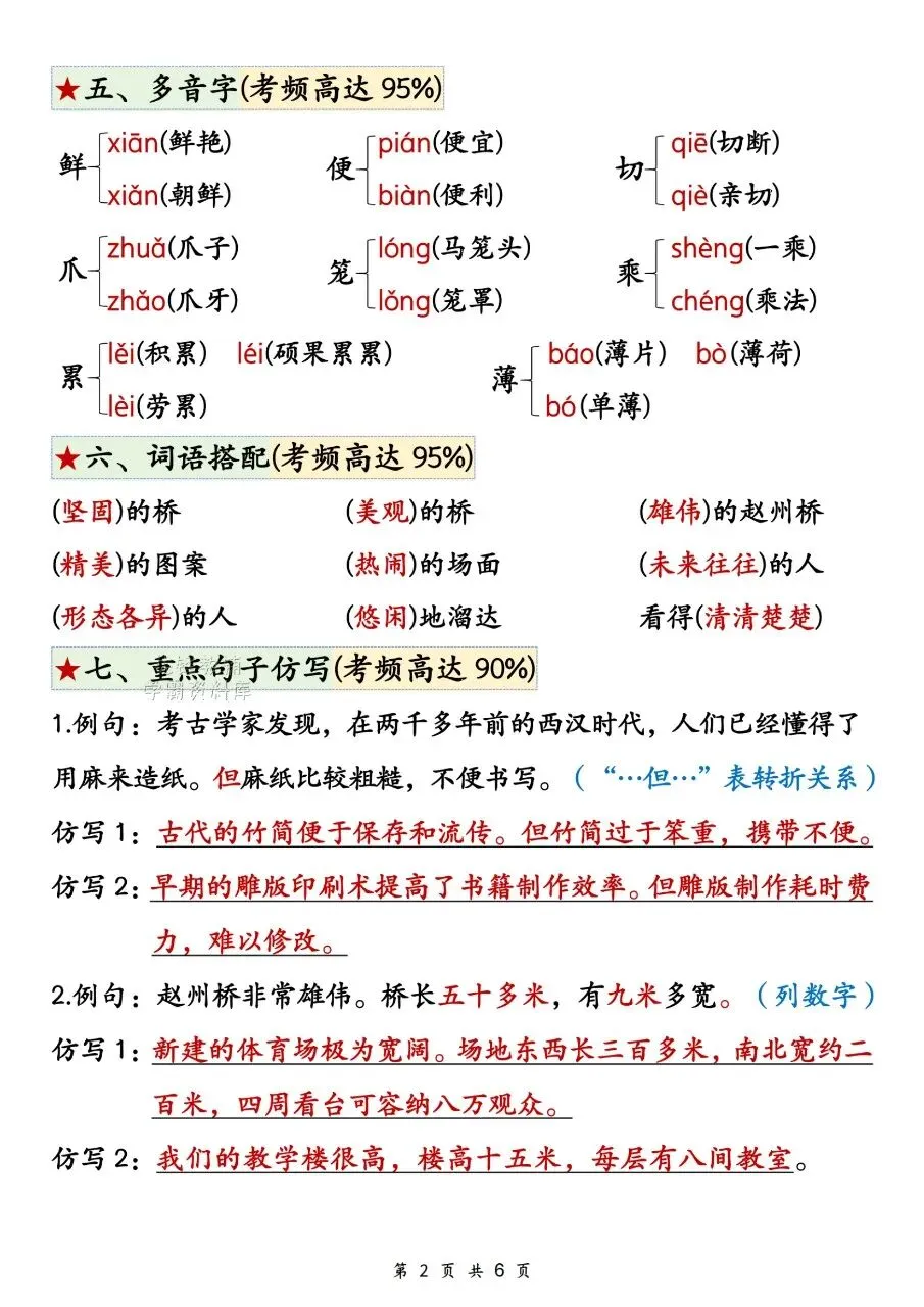 覆盖《古诗三首》《纸的发明》《赵州桥》《一幅名扬中外的画》,标注考频,适合单元复习与考前快速背诵。
