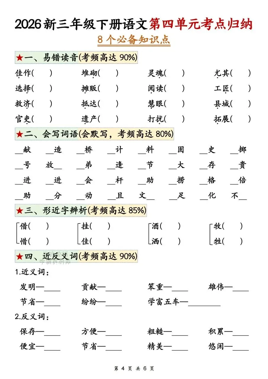 三年级下册语文|第四单元考点归纳(可下载打印)