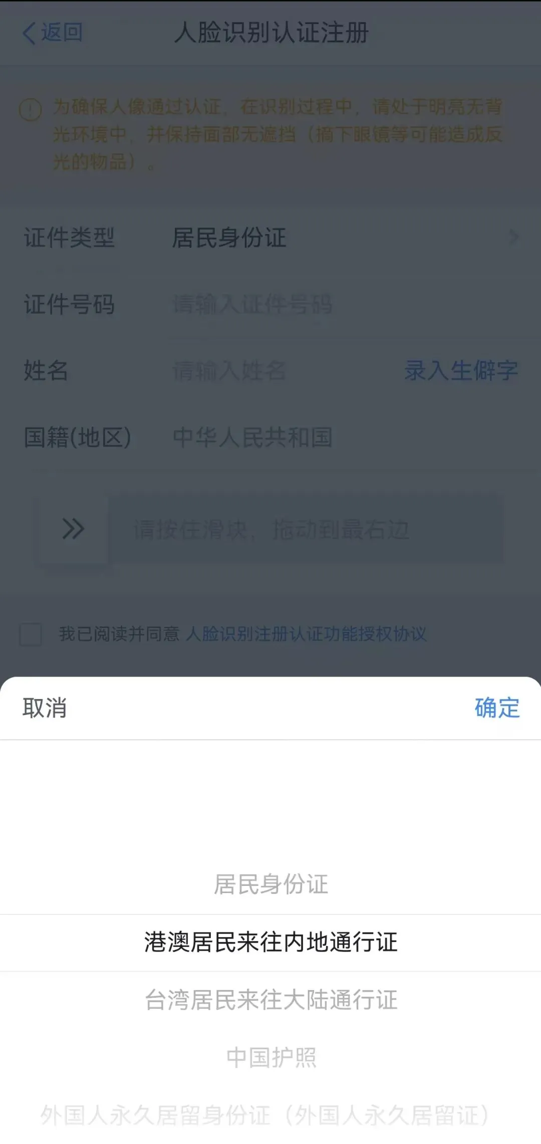 这时,我们需要先看看手里面拿的有效证件是什么类型。因为【人脸识别认证注册】目前只支持居民身份证、港澳居民来往内地通行证、台湾居民来往大陆通行证、中国护照、外国人永久居留身份证(外国人永久居留证)、中华人民共和国港澳居民居住证和中华人民共和国台湾居民居住证。