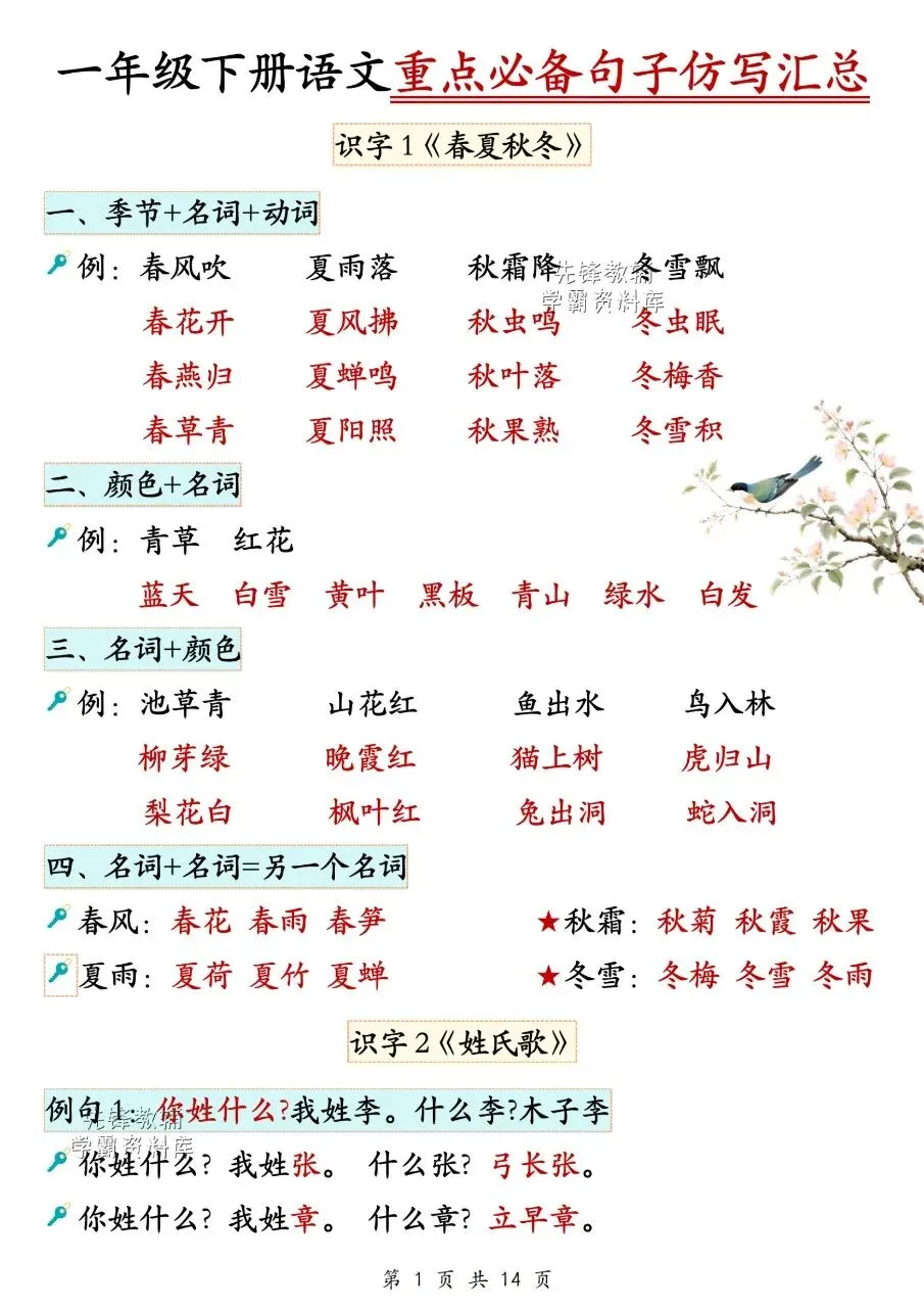 一年级下册语文|重点必备句子仿写汇总(可下载打印)