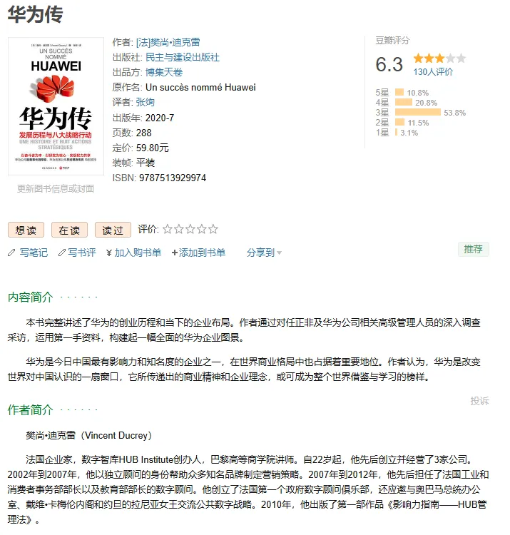 作者: [法]樊尚•迪克雷出版社: 民主与建设出版社出品方:博集天卷原作名: Un succès nommé Huawei译者: 张绚出版年: 2020-7ISBN: 9787513929974
