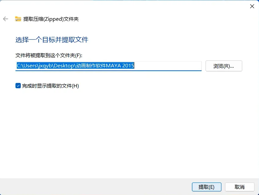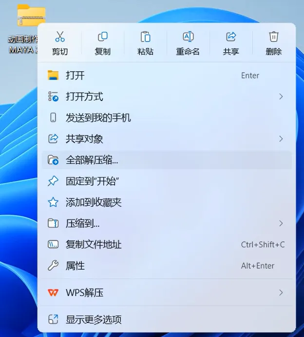 2.1,鼠标右击【动画制作软件MAYA 2015】压缩包(Win11系统需先点击“显示更多选项”)选择【全部解压缩】。如下图: