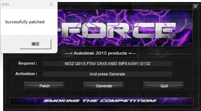 2.17,生成激活码:①复制2.14步中【申请号】后的代码;②将复制的内容粘贴到【Request】后的框中;③点击【Patch】;④点击【确定】;⑤点击【Generate】生成激活码。