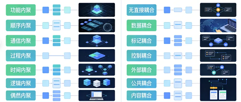 说人话:为了方便程序模块的扩展与复用等需求,模块间应该如何“保持距离”,模块内部又该怎样“紧密结合”。
