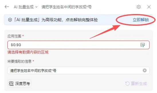 文章开始时想着“把学生姓名中间的一个字改成*”,一直没有完成,所以想用别的办法完成这个任务。于是我首先想到的是WPS自带的WpsAI,结果需要“解锁”才能完成。