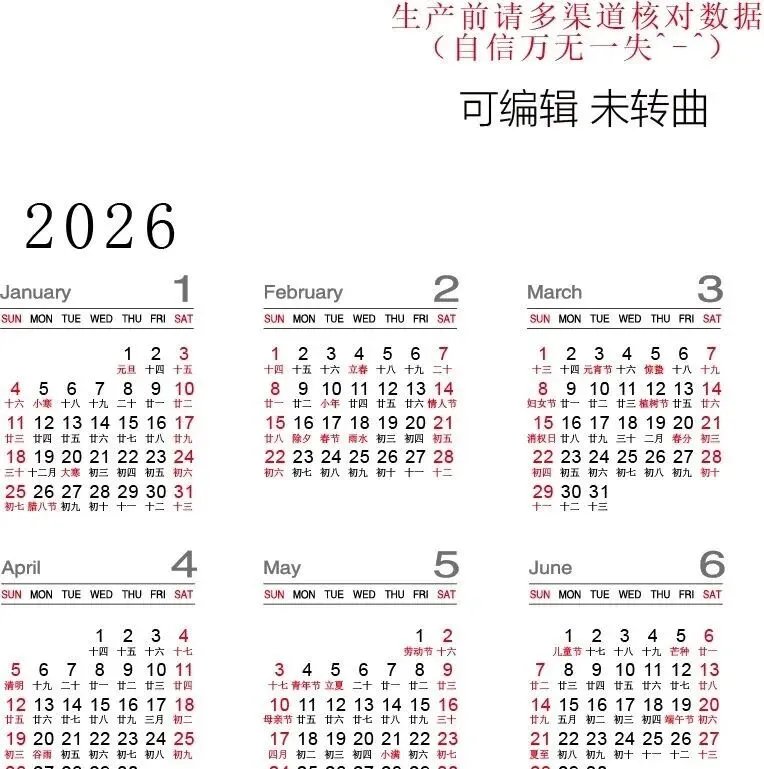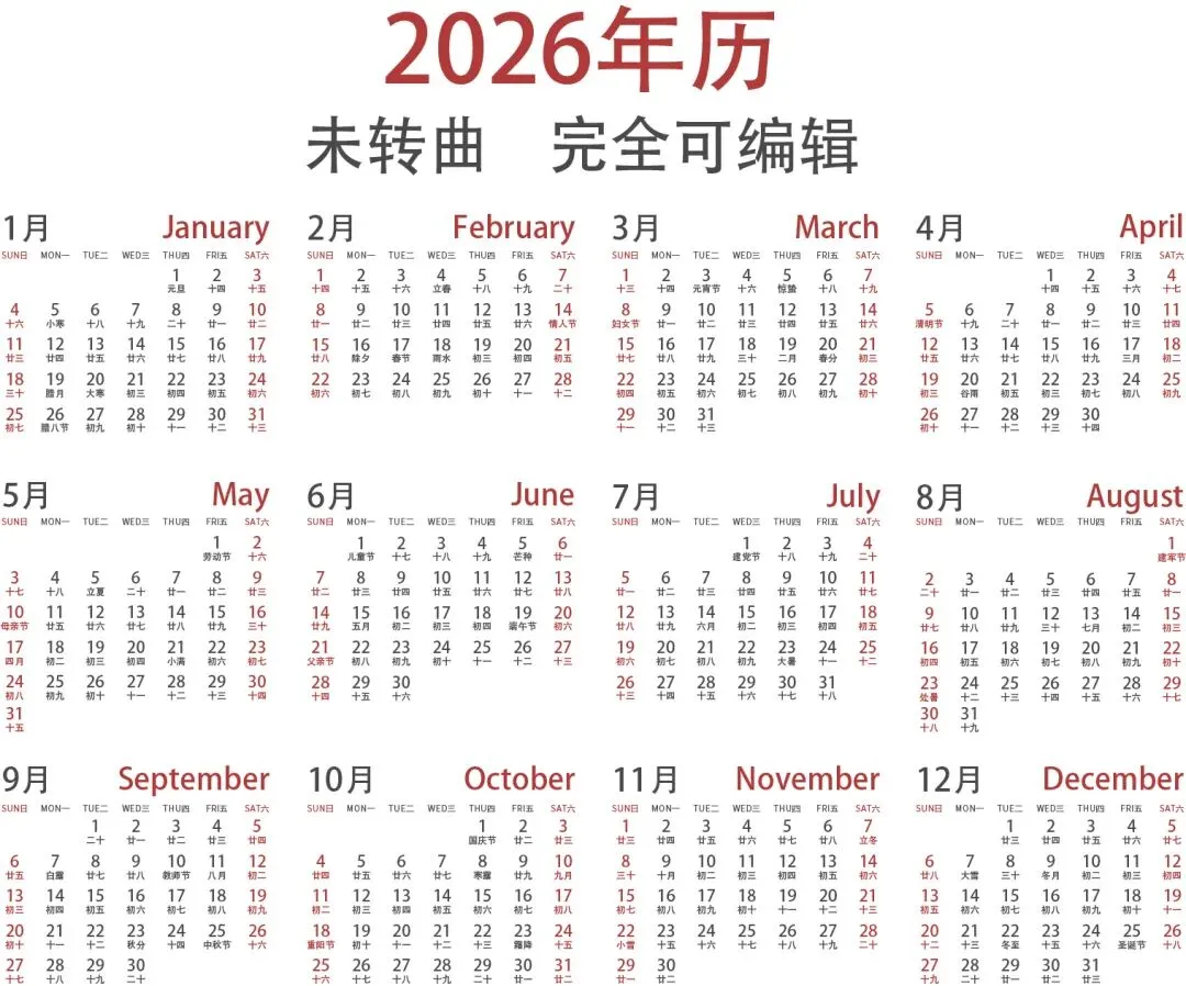 时间管理必备!2026 全年高清日历台历表电子版来袭,Excel 格式可免费保存,轻松实现一张图月历年历展示,还能直接打印。清晰标注了法定节假日、调休安排及二十四节气,可用于办公规划日程、学生打卡学习或家庭记录事务等,让你的 2026 年日程安排井井有条。