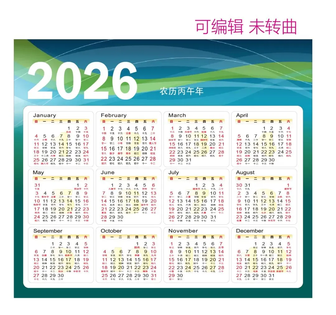 2026全年高清日历台历表|Excel电子版【免费保存】可打印一张图 含月历年历+法定假日+农历 办公家用通用