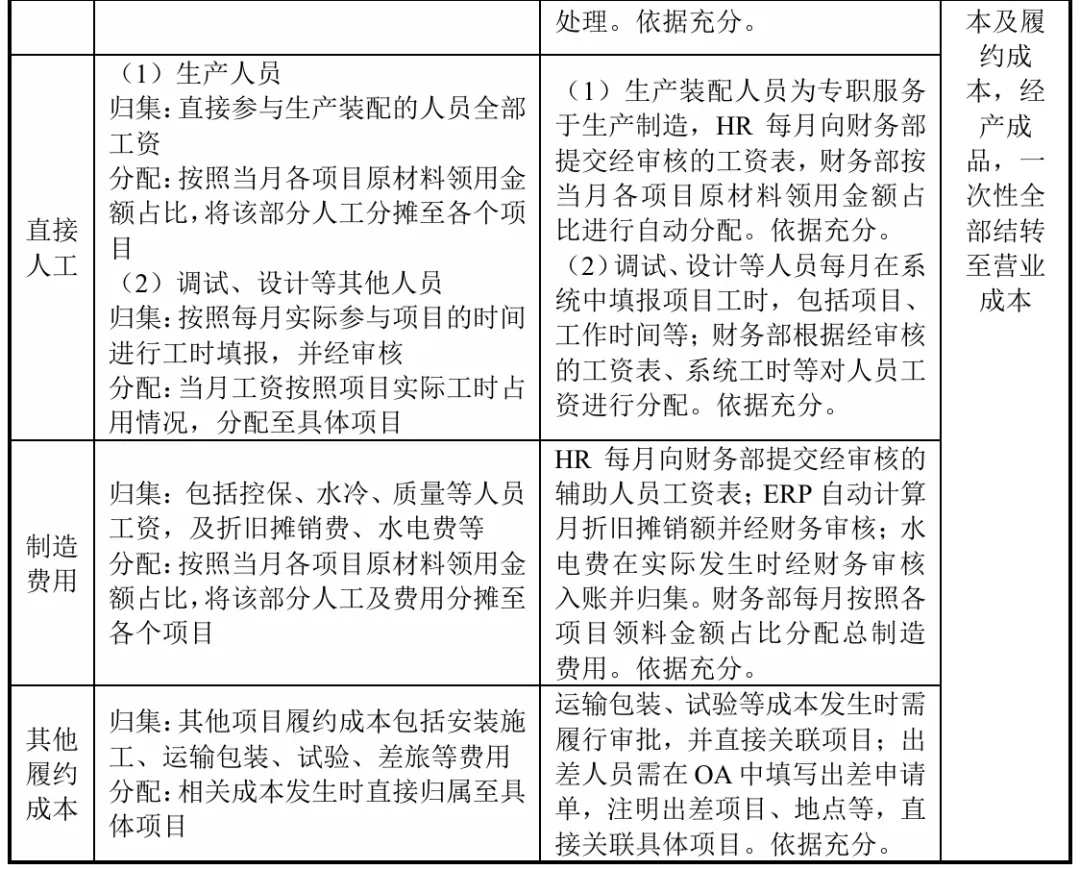 公司原材料均可以在材料领用时直接归集至具体项目;调试、设计等其他人员工资虽不能全额直接归集到具体项目,但通过项目工时填报情况,可以准确分配到各个项目当中;公司运输、试验、施工、差旅等成本均是为某个项目直接发生,因此可以直接归集到具体项目当中。因此总体来看,原材料、调试和设计等其他人员工资,运输、试验、施工、差旅等其他履约成本,均可以直接归集至具体项目,成本归集与分配需履行必要的内部控制审核,可以保证成本的真实准确。无法直接归属到项目的成本主要为生产人员工资、制造费用。考虑到原材料是项目成本的最主要构成,且往往原材料需求规模较大的项目,需要安排的生产制造人员数量、时间较多,占用的生产用固定资产量及能源耗用量也较大,因此两项成本均按照当月各项目原材料领用金额占比进行分配具有合理性。生产人员工资、制造费用的归集、分配过程均需履行必要的内部审批及控制,可以保证成本的真实准确。