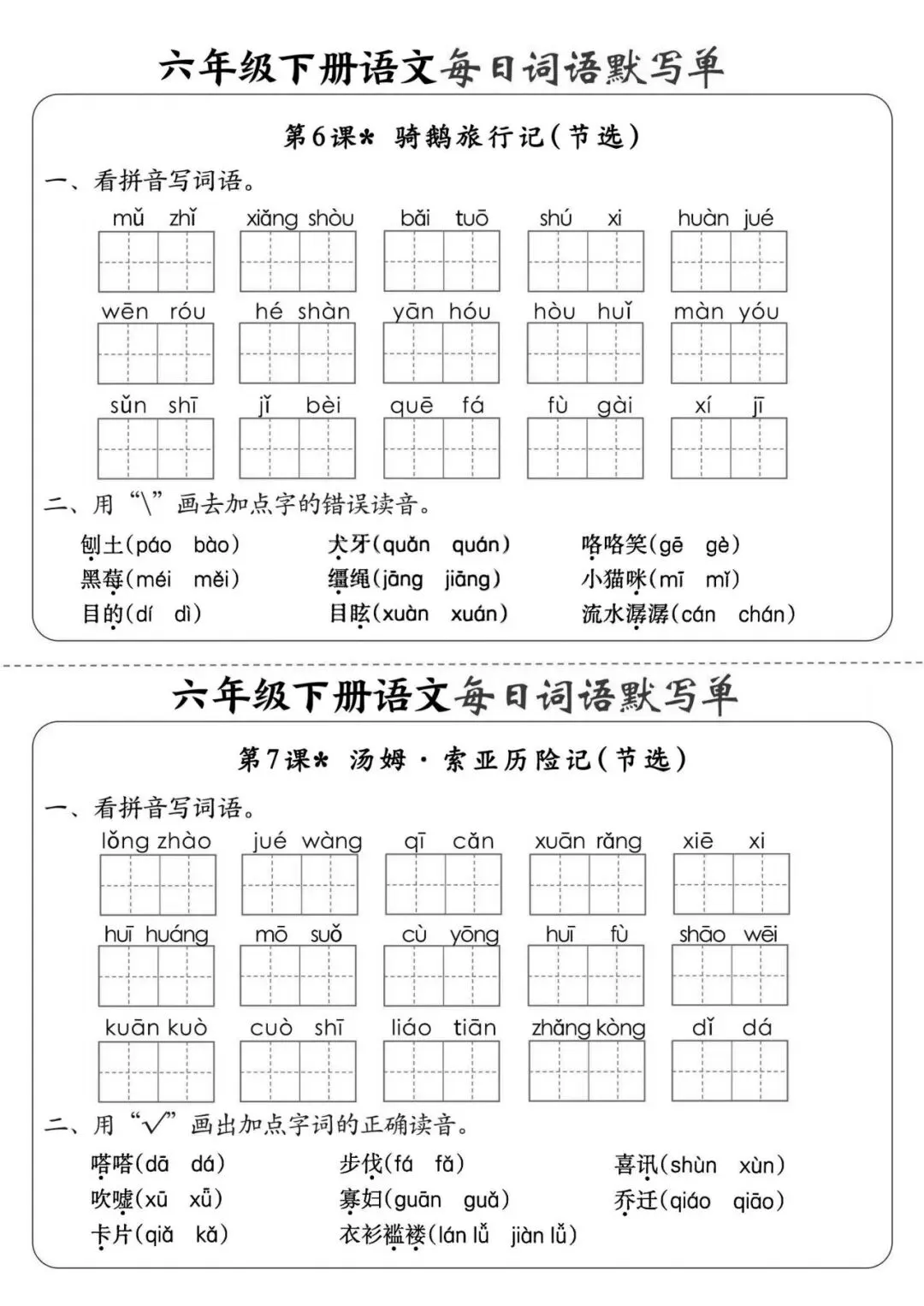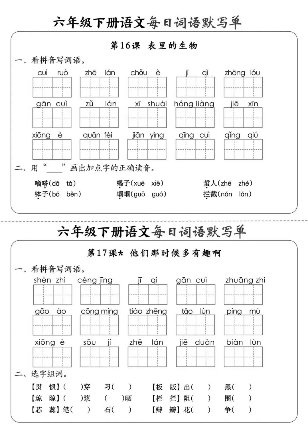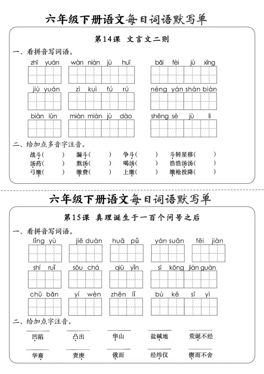 六年级下册语文《课本同步默写每课一练》 电子版可打印
