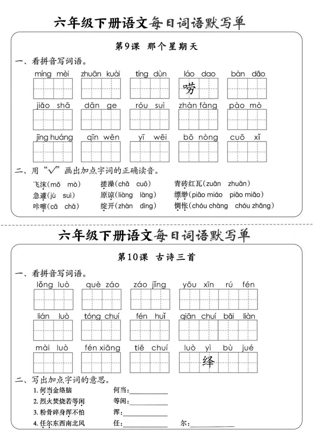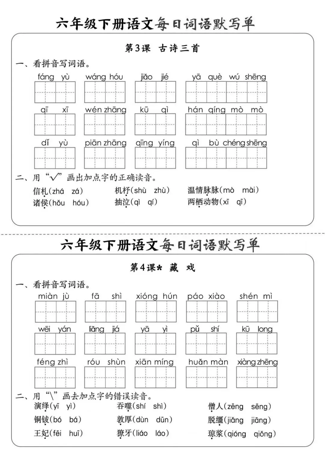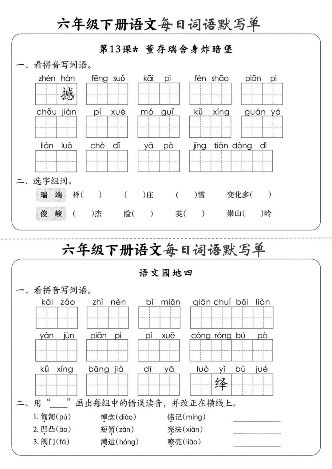 六年级下册语文《课本同步默写每课一练》 电子版可打印