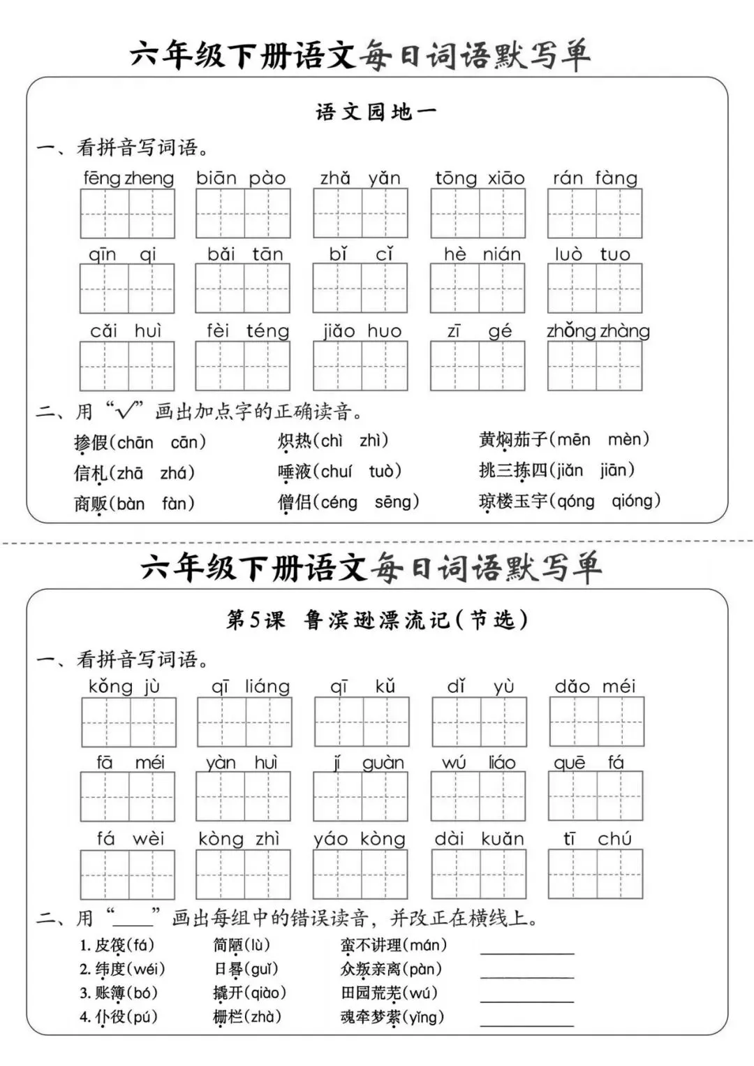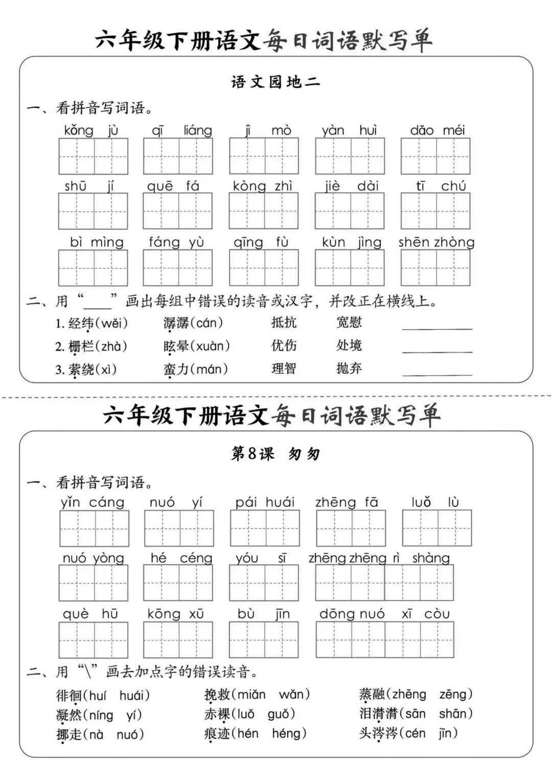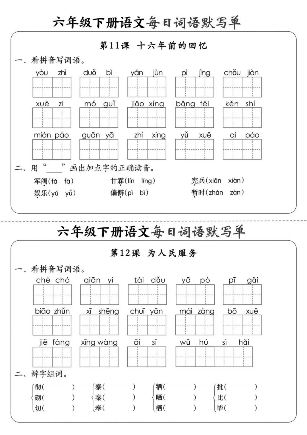 今日分享的是:六年级下册语文《课本同步默写每课一练》,电子版可下载打印。