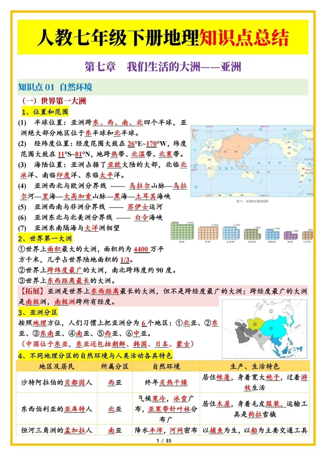 大家好,今天老师整理了:2026版七年级下册地理知识点背诵,可打印电子版!