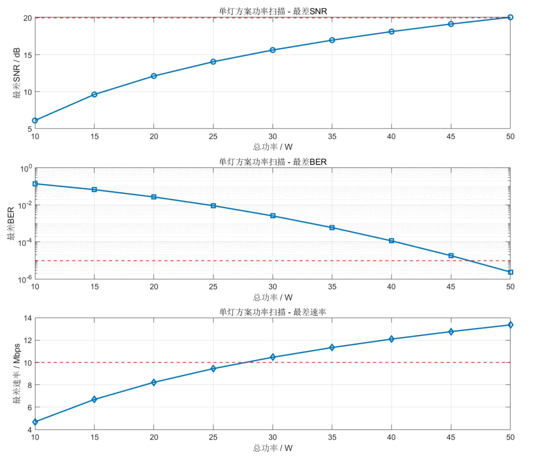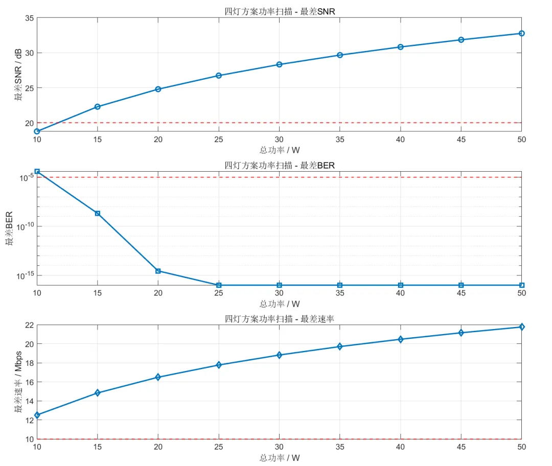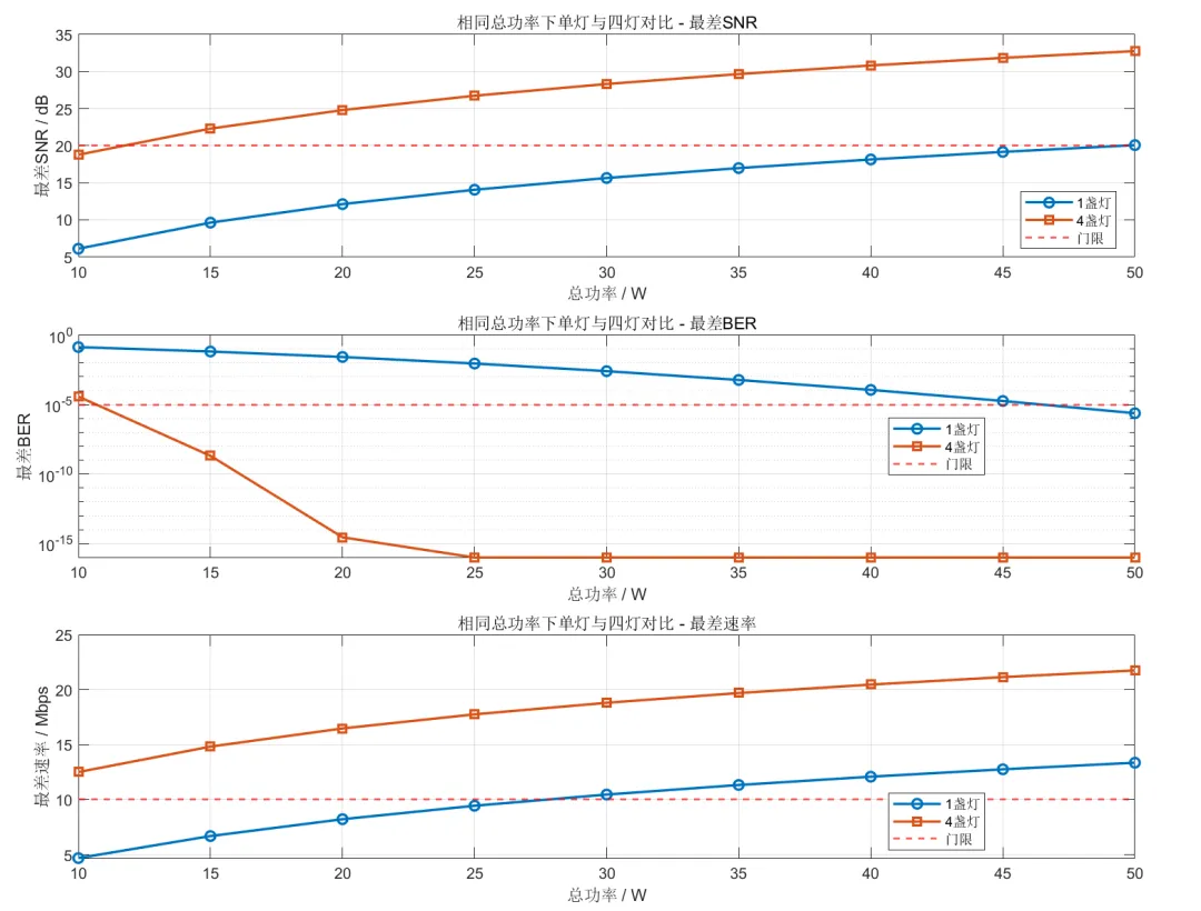 从同总功率对比结果看,四灯方案在整个扫描范围内均优于单灯方案。无论是最差SNR、最差BER还是最差速率,四灯方案均表现出更优的趋势。这一结果说明,布局优化在室内可见光通信中并不是次要因素,而是决定最差点性能的核心变量之一。单灯方案的问题在于其覆盖中心性过强,系统性能高度依赖某些位置与单一光源之间的几何关系,导致中心区域裕量较大而边缘区域长期受限;四灯方案则通过缩短多数位置到最近光源的等效距离,并增强多灯叠加效应,显著抬升了边界区域与角落区域的性能水平,从而推动系统更早达到全空间达标状态。