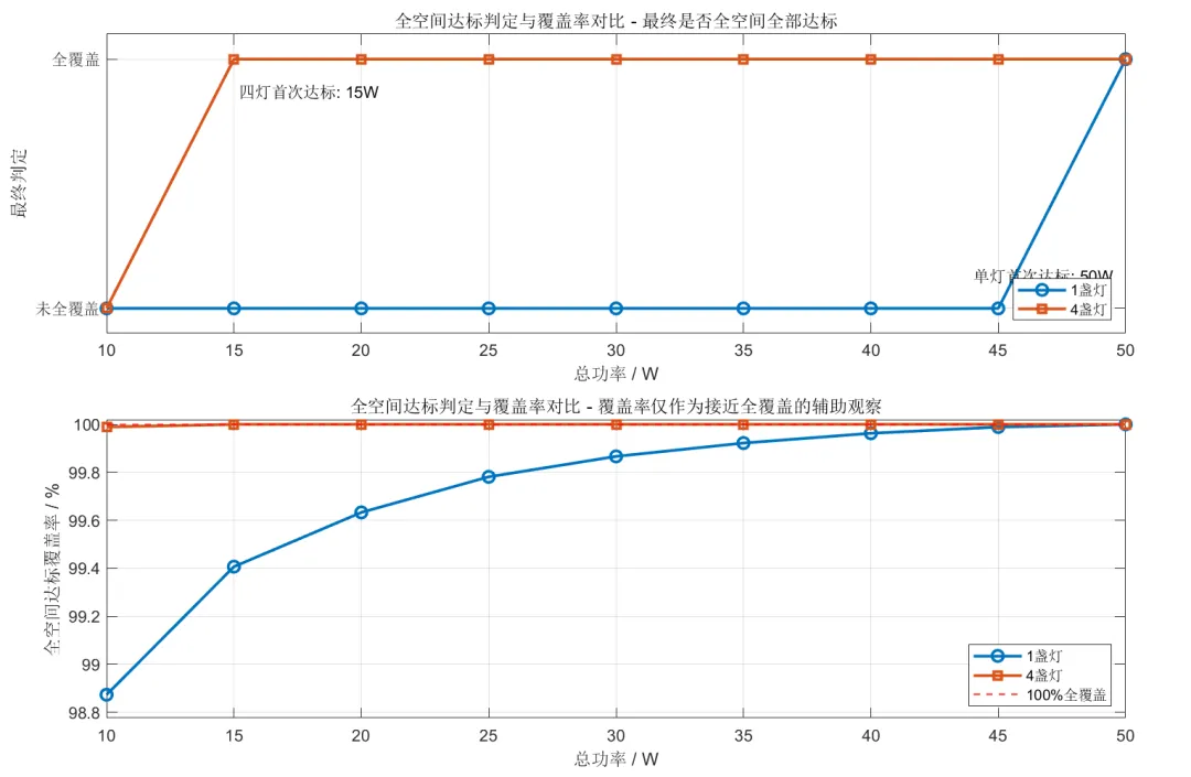 在仿真设计中,功率变量设置为10 W至50 W的离散扫描序列,步长为5 W。对于单灯方案,总功率全部由一盏灯承担;对于四灯方案,总功率由四盏灯平均分配,以保证两类方案在比较时具有一致的总功率基准。这样设置的目的在于回答两个核心问题:其一,在固定场景和固定指标约束下,单灯方案与多灯方案各自在何种总功率条件下能够首次实现全空间全部达标;其二,在总功率相同的前提下,多灯分布式布局是否比单灯集中式布局具有更高的空间覆盖效率。