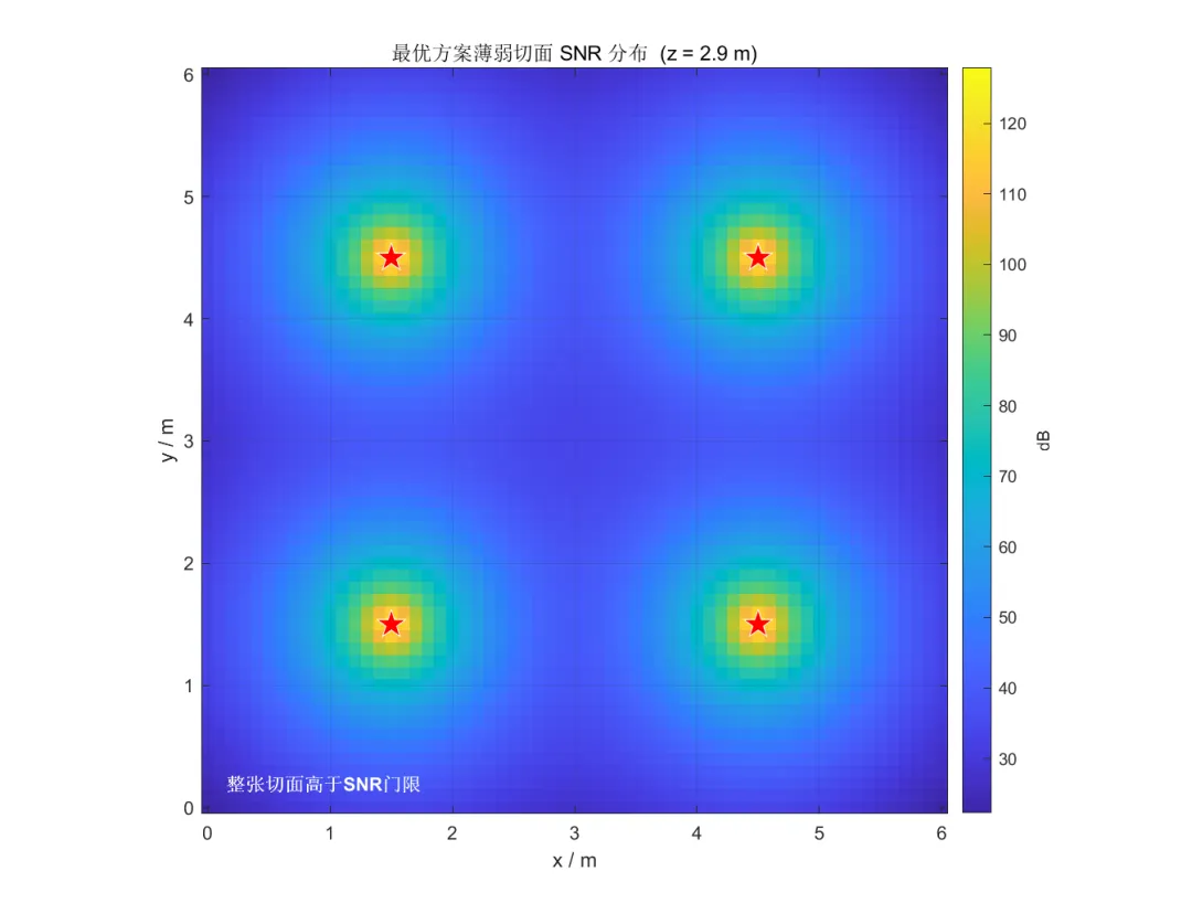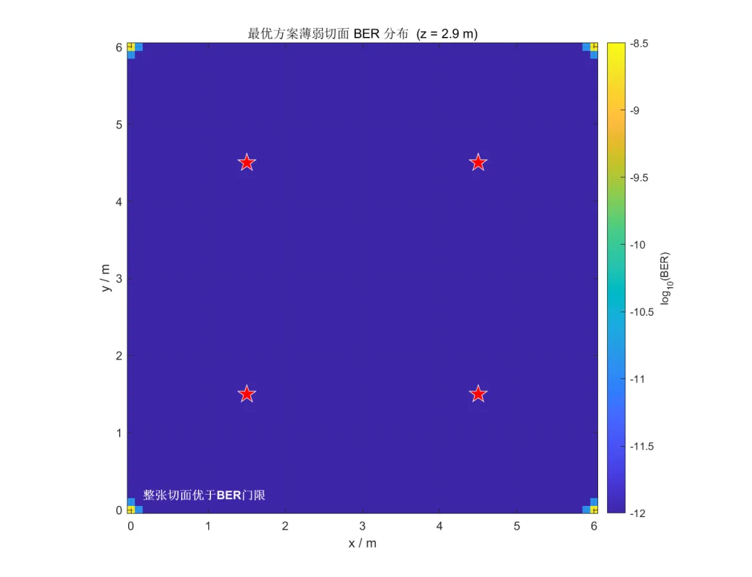 在空间扫描方面,本文采用三维离散评估方式,对房间内部有效接收空间进行逐点分析。考虑到实际接收端不可能与地面、墙面或天花板完全重合,本文将室内边界内侧的可用空间作为评价对象,从而避免边界几何退化点引入非物理结果。对每个离散点,分别判断其是否满足SNR、BER和速率三项门限,并在此基础上统计方案在全空间范围内是否实现全部达标。同时,为更直观地展示系统空间分布规律,本文还针对最优方案自动提取最薄弱水平切面,对该切面上的SNR分布、BER分布与速率分布进行分析,以便识别系统中最不利位置和裕量分布特征。