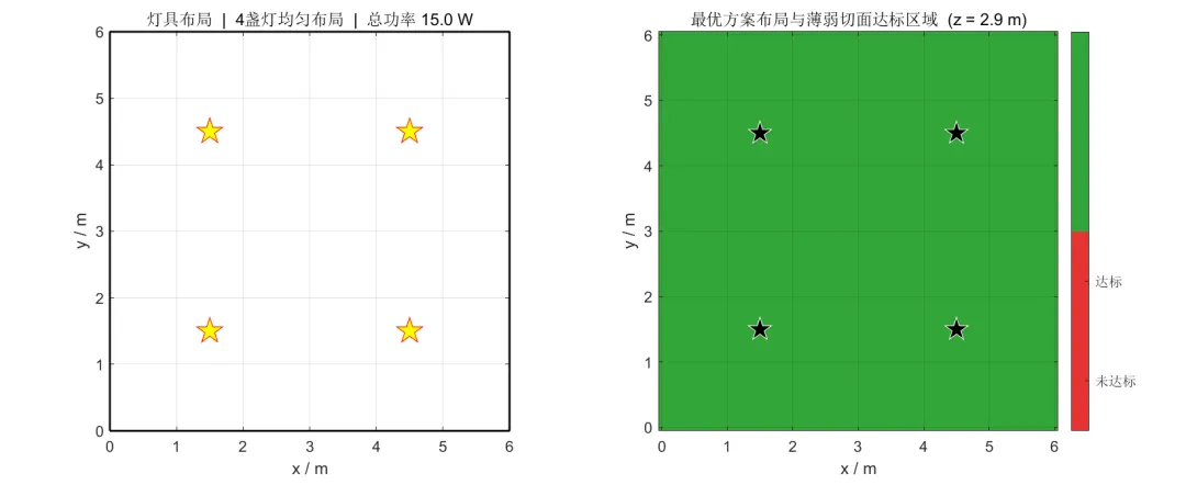 综合三项门限约束、全空间严格判定和最低功耗原则,本文推荐的最优方案为:在房间顶面采用四盏LED均匀布局,总功率设置为15 W。该方案是当前功率扫描集合中首个实现全空间全部达标的最低功率方案。与单灯方案相比,其优势并不在于简单增加光源数量,而在于通过空间重构显著改善了系统最差点的受光条件,使原本容易成为瓶颈的角落和边界区域获得了更高的功率叠加收益。