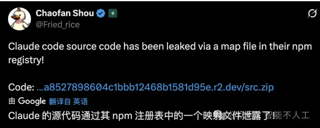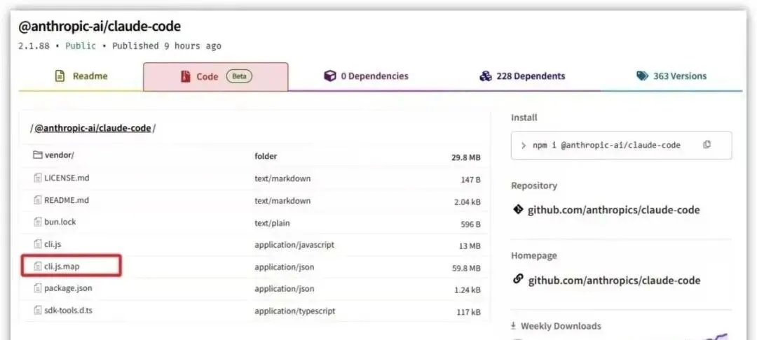 起因极其简单:Anthropic 在发布 Claude Code v2.1.88 时,意外将一个体积约 57MB 的 cli.js.map 文件一起打包进了 npm 包。