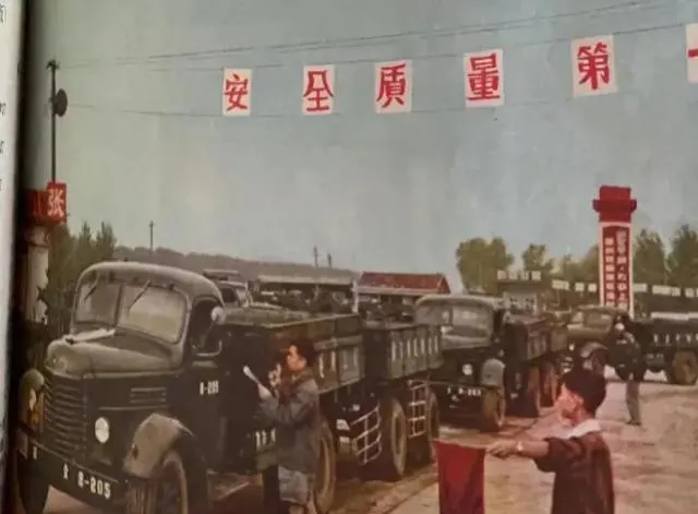 这一队排队进门的老卡车就是解放CA10,小孩举着队旗挥手,挂车连成串,每次连队提货、卸货都得靠这批主力,现在回头想想,热闹场面是再没了。