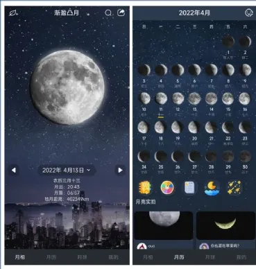 它支持全面的月亮知识科普功能,包括:月相、月食、地月关系、月球陨石科普、月球的成因、月球的科普等。