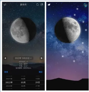 它支持实用的月相盈亏功能,可以看到不同日期月亮的样子,帮助你认识月亮的阴晴圆缺变化,选择切换任意一天,支持显示的信息包括:月相名称、月出时间、月落时间、地月距离。
