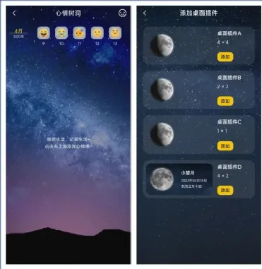 它还支持很多实用功能,包括:桌面小部件、设置月相背景、心情树洞等,其中桌面小部件功能支持4个小部件,你不需要打开软件,在手机桌面也可以看月亮。