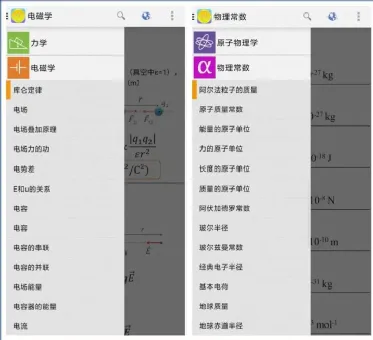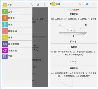 它支持强大的物理公式分类功能,包括:力学、电磁学、热学、周期运动、光学、原子物理学、物理常数。