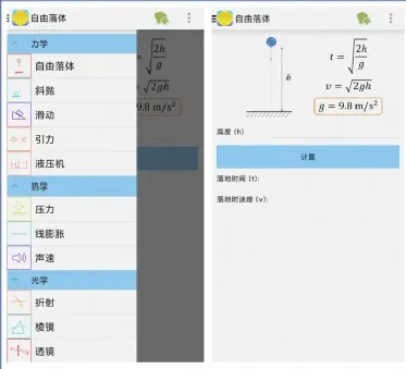 它支持物理工具版块,包括:自由落体、斜抛、滑动、引力、液压机、压力、线性膨胀、声速、折射、棱镜、透镜、相对论质量、时间膨胀。