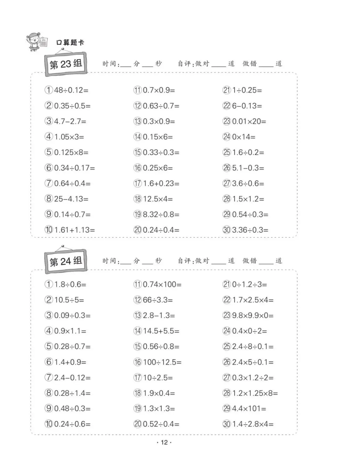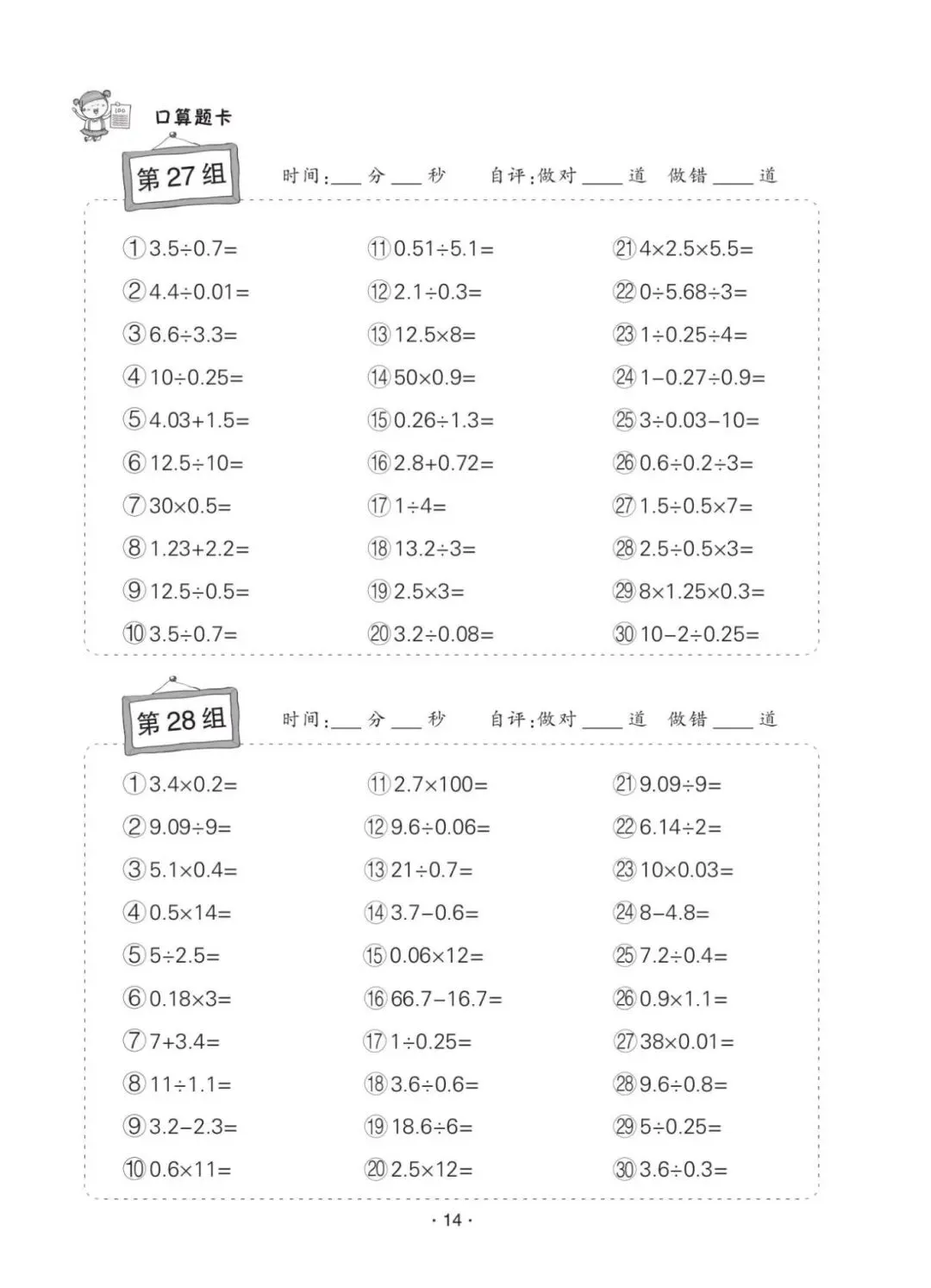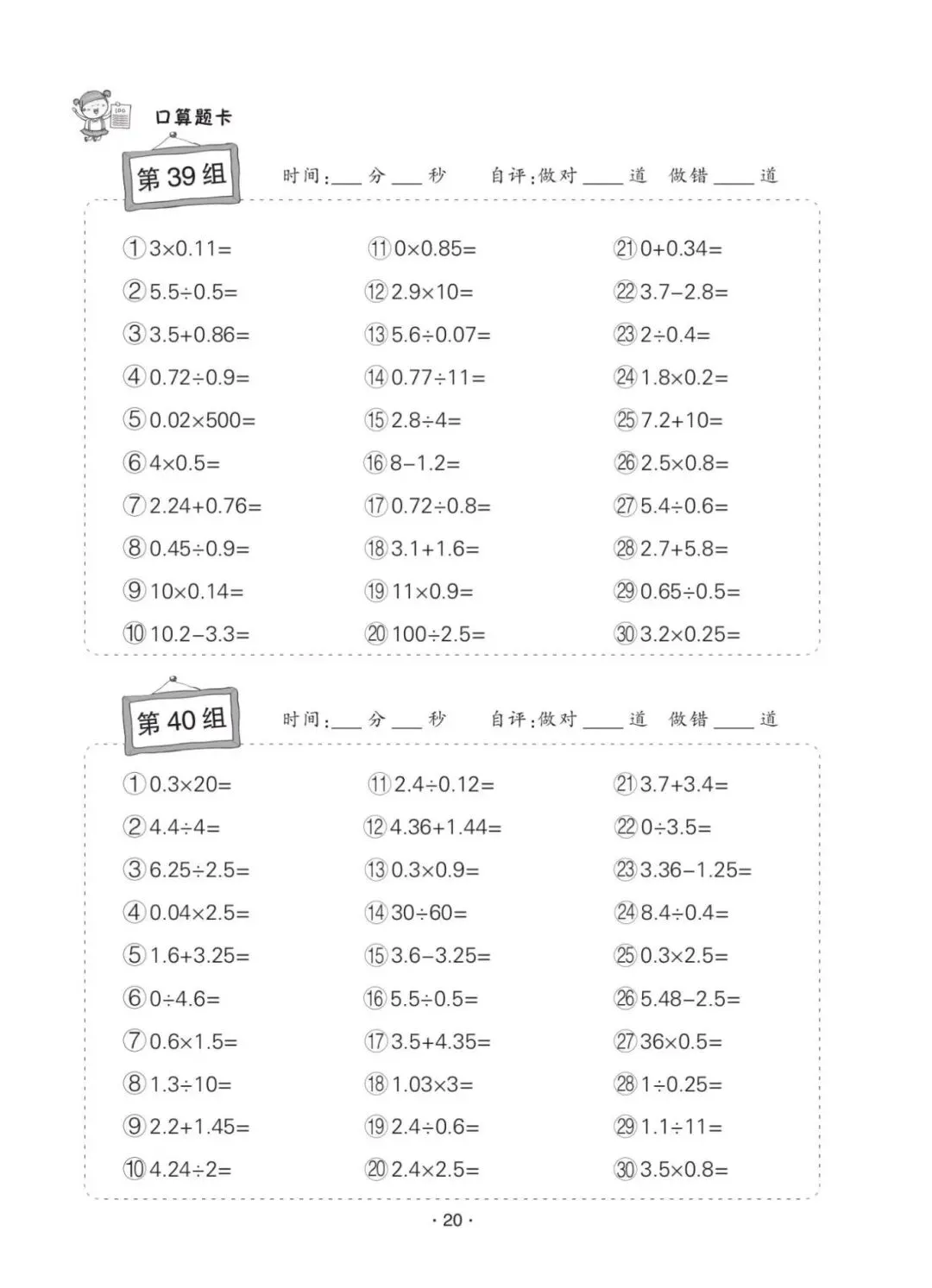 人教版五年级下册数学口算题卡天天练,电子版可下载打印