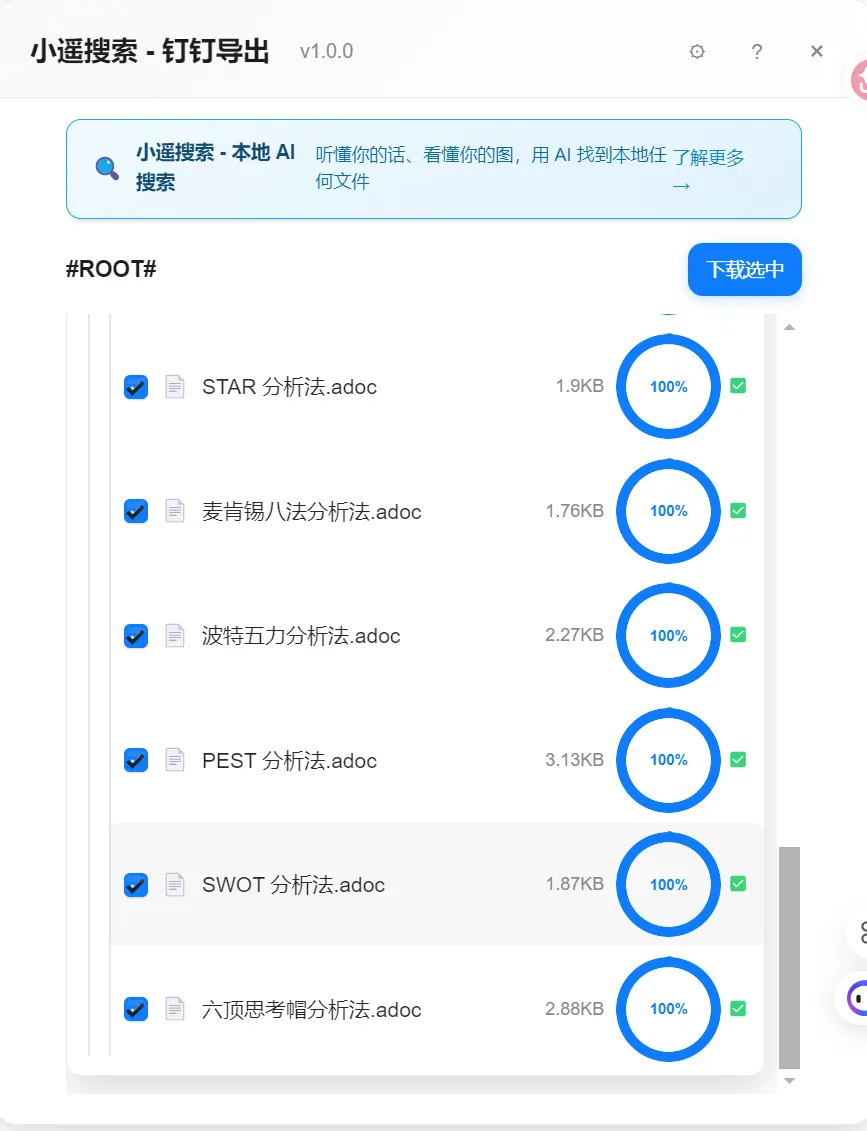 选择多个文档或文件夹,点击”下载选中”即可批量导出,实时显示导出进度。