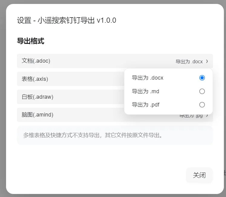 自定义各类文档的默认导出格式,支持 .docx/.md/.pdf/.xlsx/.jpg 等多种格式。