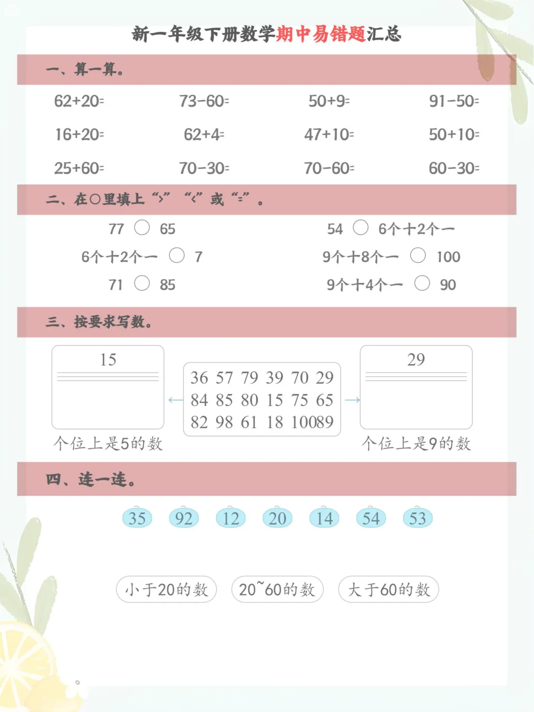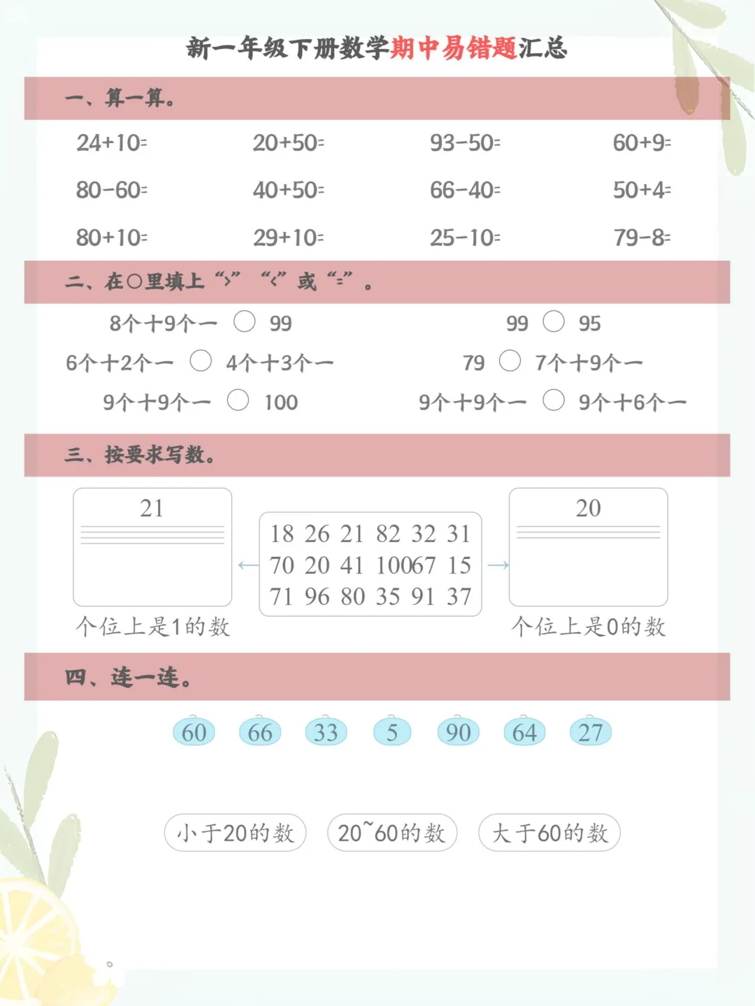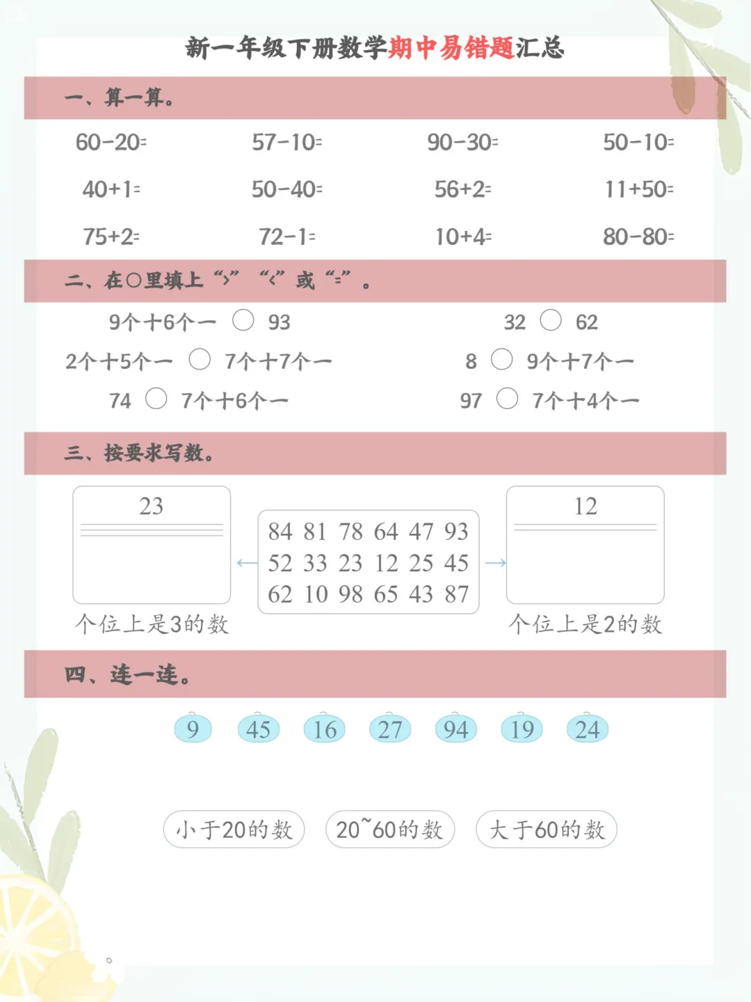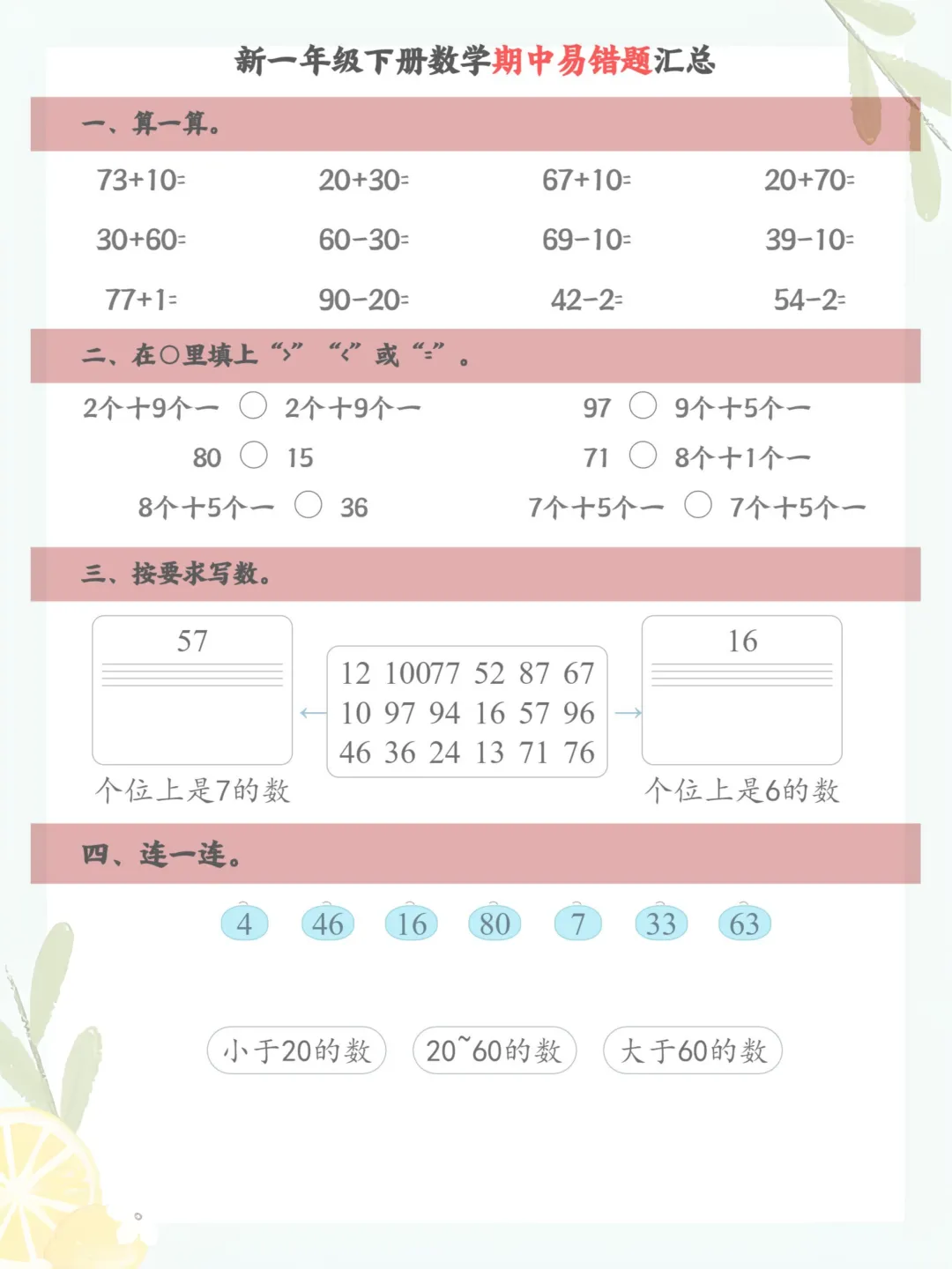 新一年级下册数学期中易错题汇总,共15页,电子版可下载可打印,这份资料紧扣一年级下册数学期中复习需求,围绕孩子在阶段学习中常见的易错题进行整理归纳,涵盖多个核心知识点与专项训练内容,能够帮助孩子查漏补缺、巩固基础、提升审题与运算能力,特别适合家长在考前为孩子安排针对性练习,需要的家长可以抓紧下载打印出来,让孩子练一练。