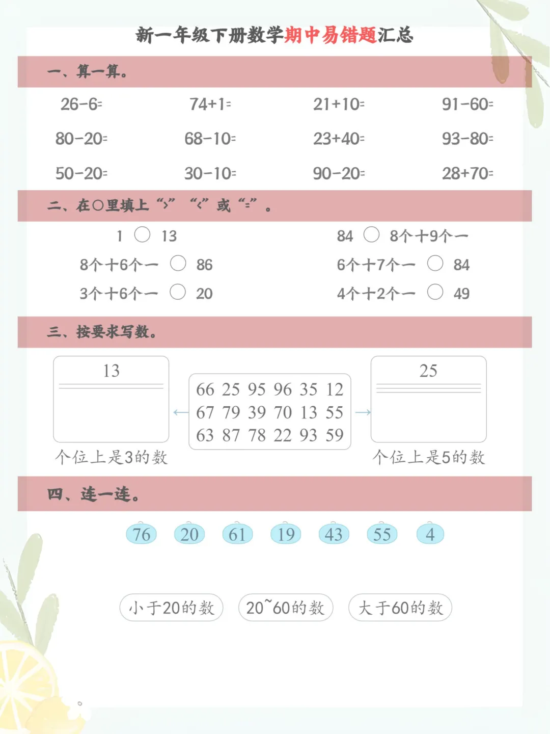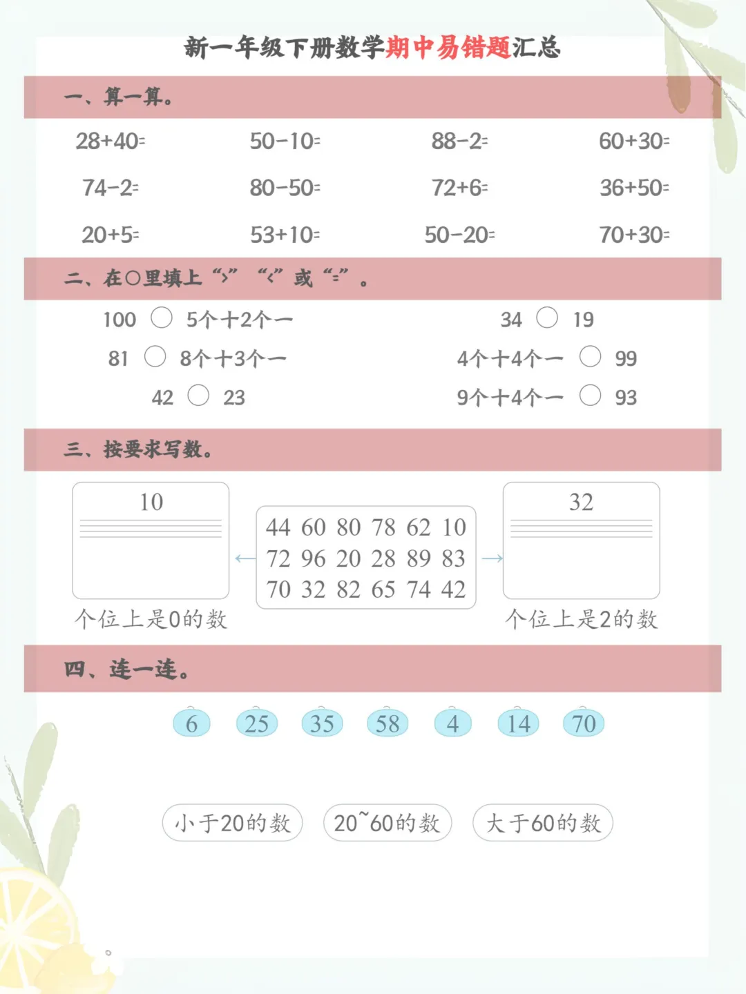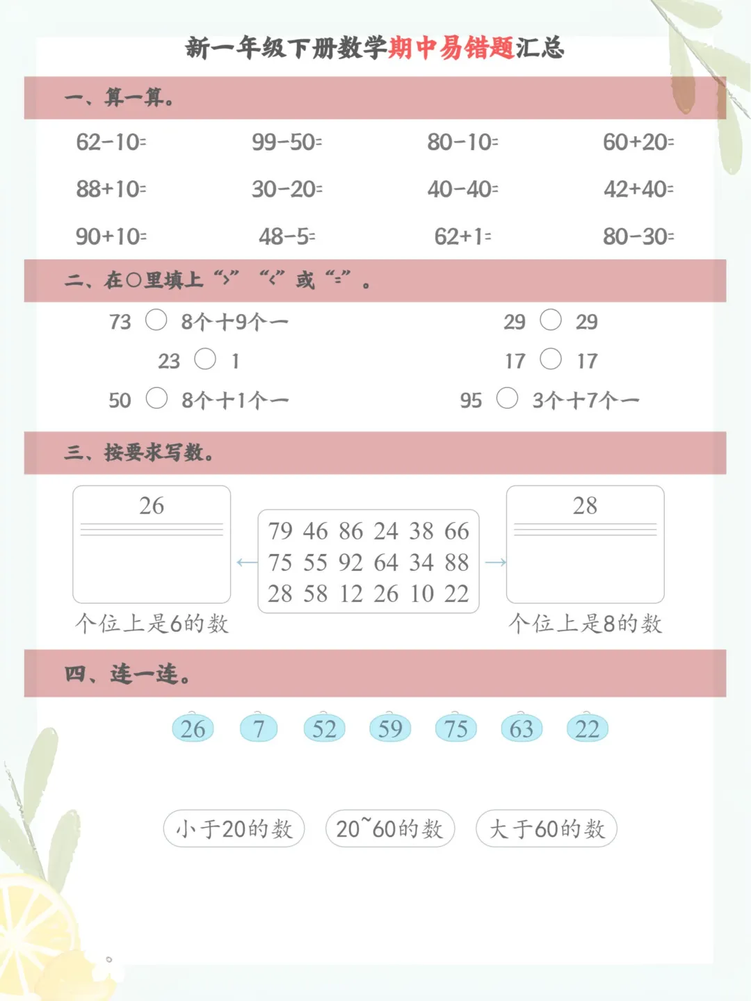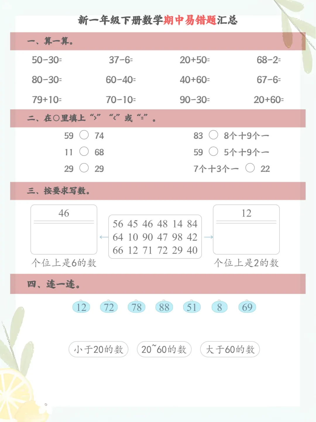 新一年级下册数学期中易错题汇总,共15页,电子版可下载可打印,这份资料紧扣一年级下册数学期中复习需求,围绕孩子在阶段学习中常见的易错题进行整理归纳,涵盖多个核心知识点与专项训练内容,能够帮助孩子查漏补缺、巩固基础、提升审题与运算能力,特别适合家长在考前为孩子安排针对性练习,需要的家长可以抓紧下载打印出来,让孩子练一练。