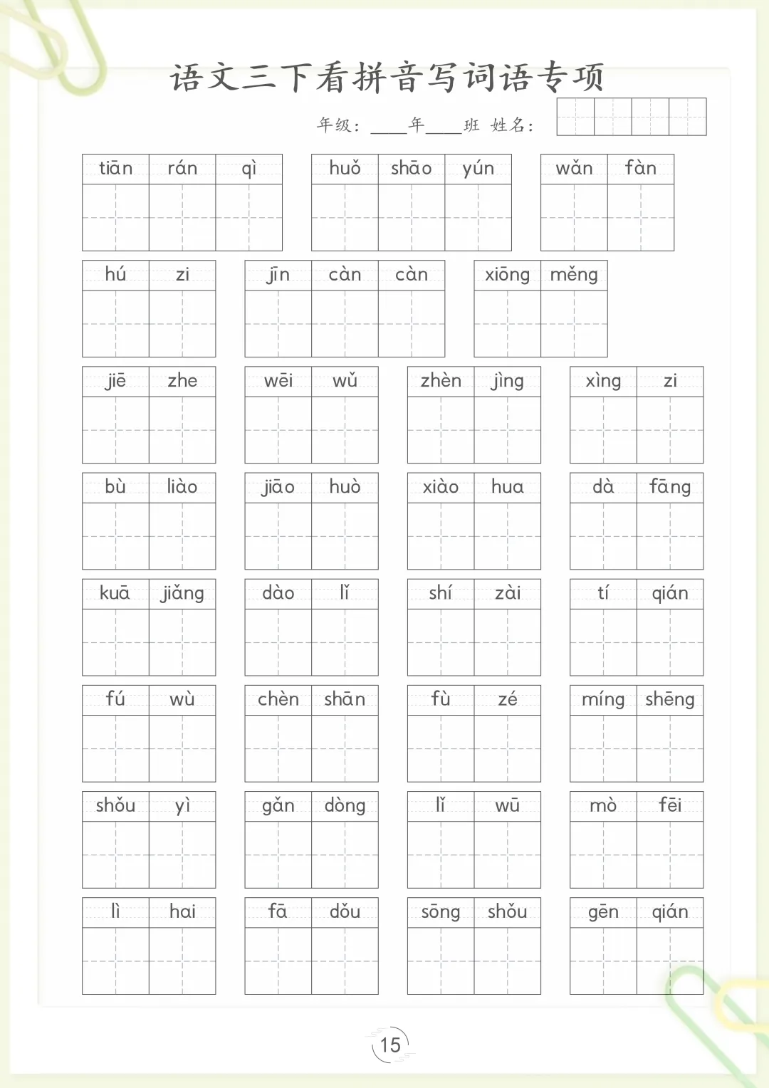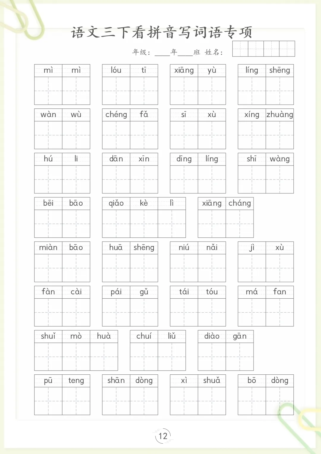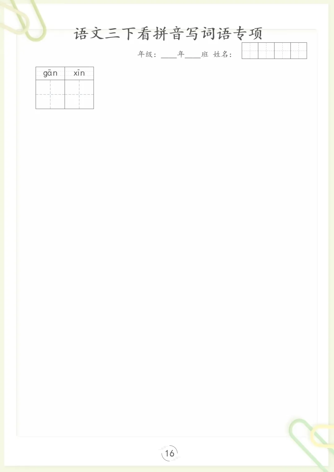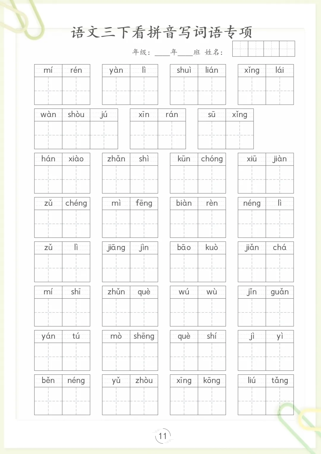 【看拼音写词语专项训练】三下语文,电子版可打印 None (温馨提示:文末有完整领取方式) 免费领取完整电子版 ①:点一点右下角的“赞”和“在看”,感谢!②:在公众号对话框中回复: 5809 ③: 点击小程序领取→电子版资料