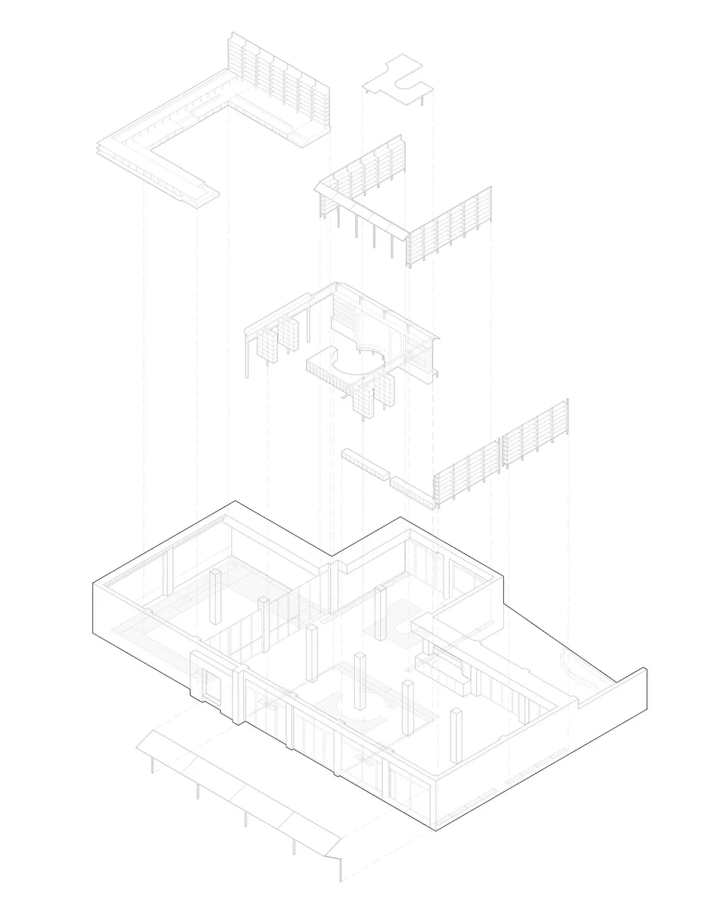 为了实现这种自由互动,设计上也采用了一种“脱开”的策略:在室内直接置入一套完全自承重的插件系统。这些插件有点像是一组放大版的“健身器材”。它们不借力于原始墙体,尽力规避老建筑不可预知的结构风险。通过“旋转”这一行为,进行简单的组合与切换,来满足不同时段的使用需求。