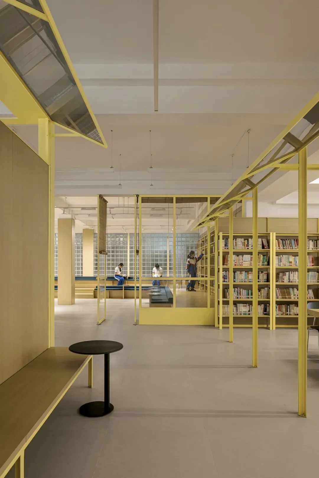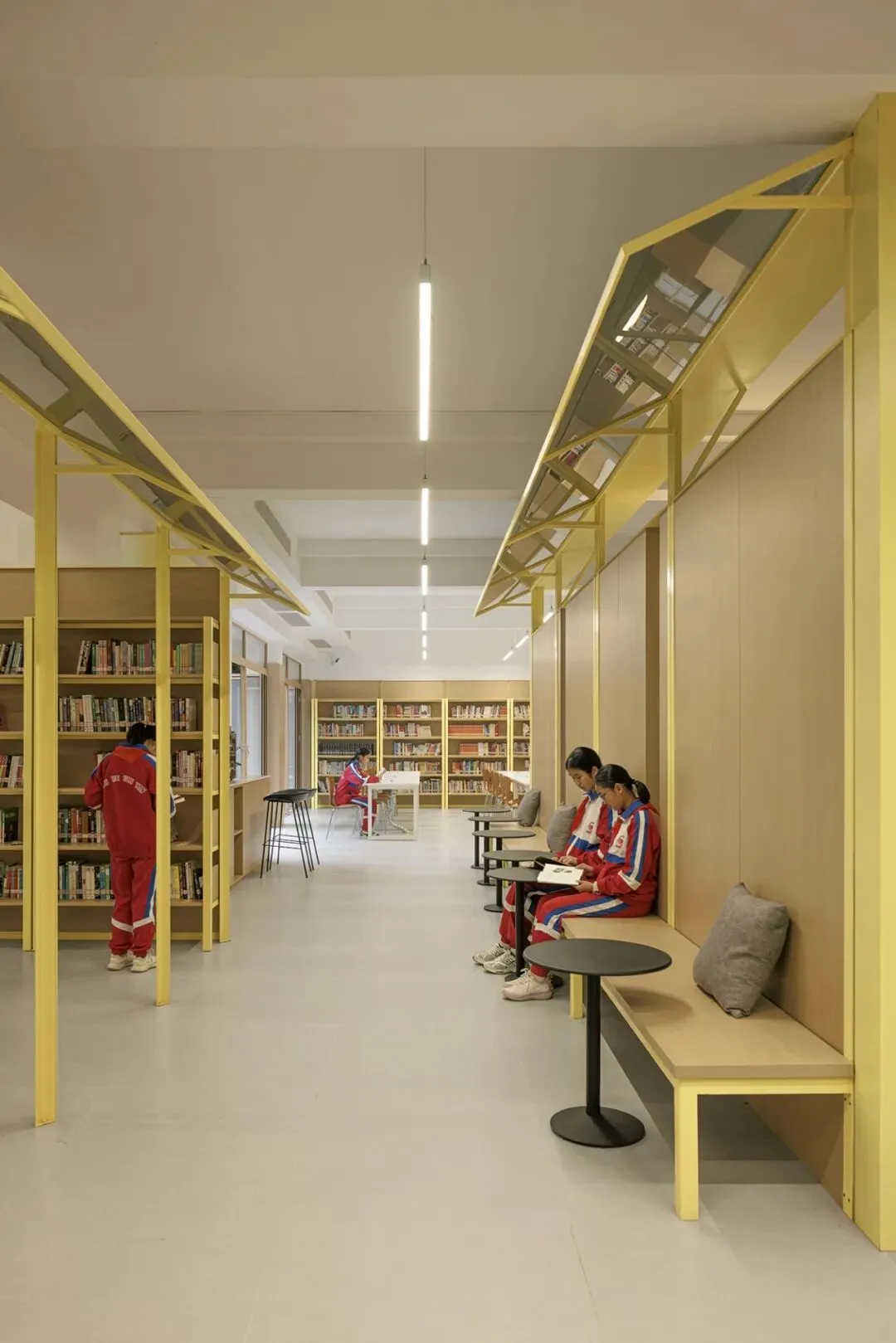 依靠这套系统,达成一个去中心化、自由穿行的流线。空间中没有使用隔墙做物理分割,而是通过地面材料的颜色变化标示区域划分。学生可以像在公园里散步一样在其中穿梭、取阅书籍,原本消极的走廊空间也由此转化为了富有流动性的公共活动场。